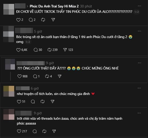 Dưới phần bình luận, nhiều khán giả bày tỏ sự bất ngờ với màn cập nhật "tình trạng hôn nhân" của Phúc Du. Khác với phần lớn các nghệ sĩ khác, nam rapper chọn tổ chức kín đáo, ấm cúng, không gây rầm rộ mạng xã hội và chỉ chia sẻ thông tin sau đó. Ngay cả nhiều Anh trai trong Vũ trụ Say Hi cũng ngạc nhiên, bày tỏ sự chúc mừng ngay ở phần bình luận.