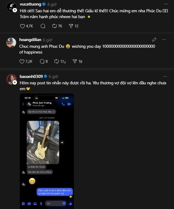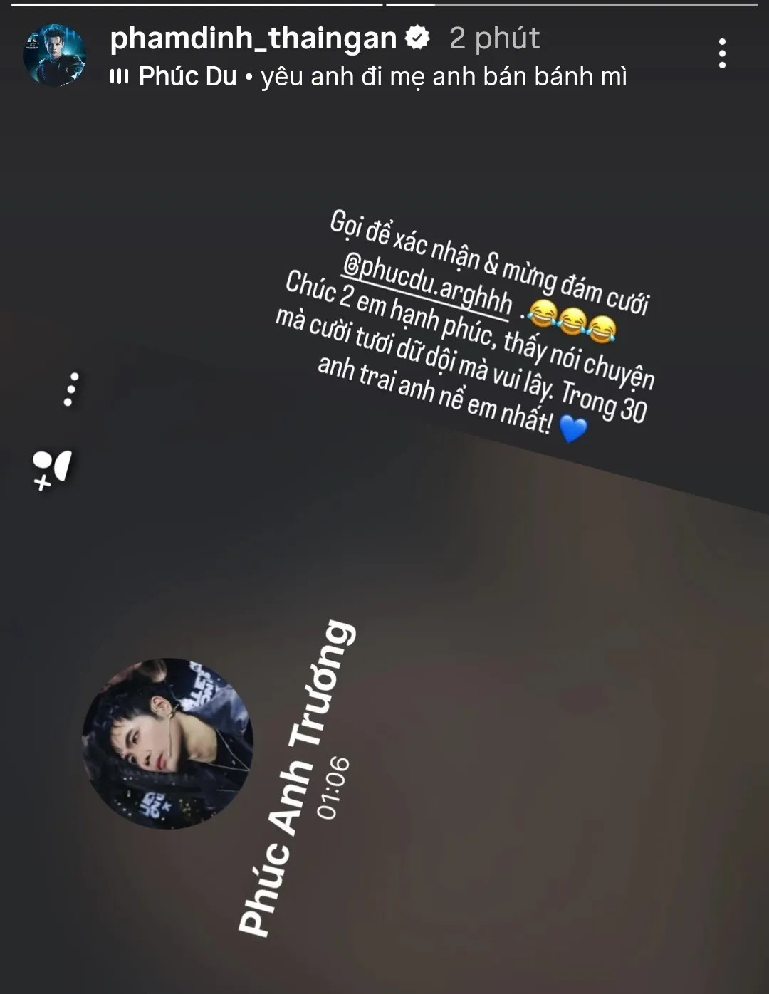 Thậm chí có một số Anh trai còn không tin nổi khi nghe tin Phúc Du "đã có chủ". Thái Ngân còn đăng Story cho biết phải gọi điện để xác nhận có thật hay không, sẵn tiện chúc mừng người em từng chung team Thoát Ra Khỏi Em trong Anh Trai "Say Hi" mùa 2.