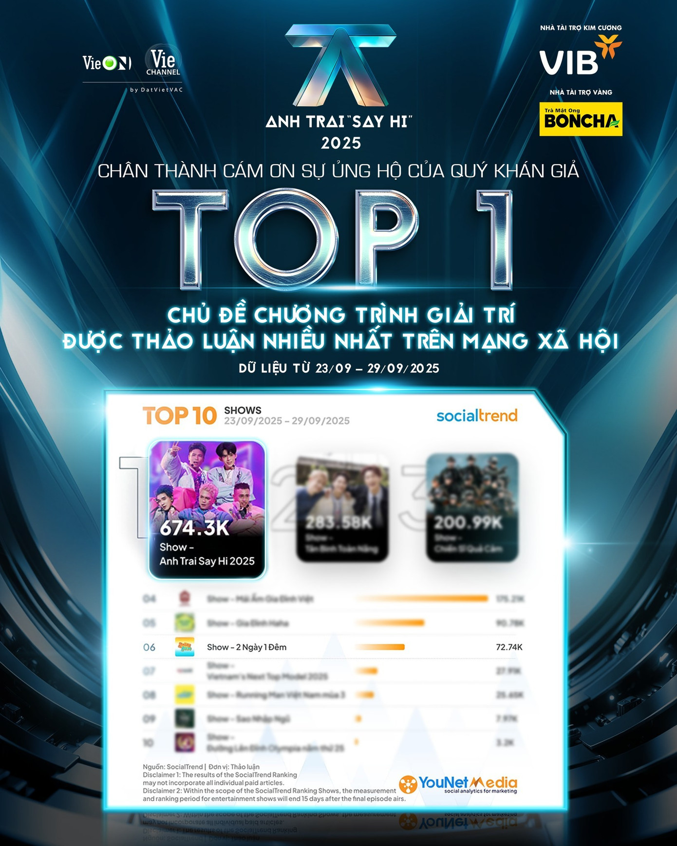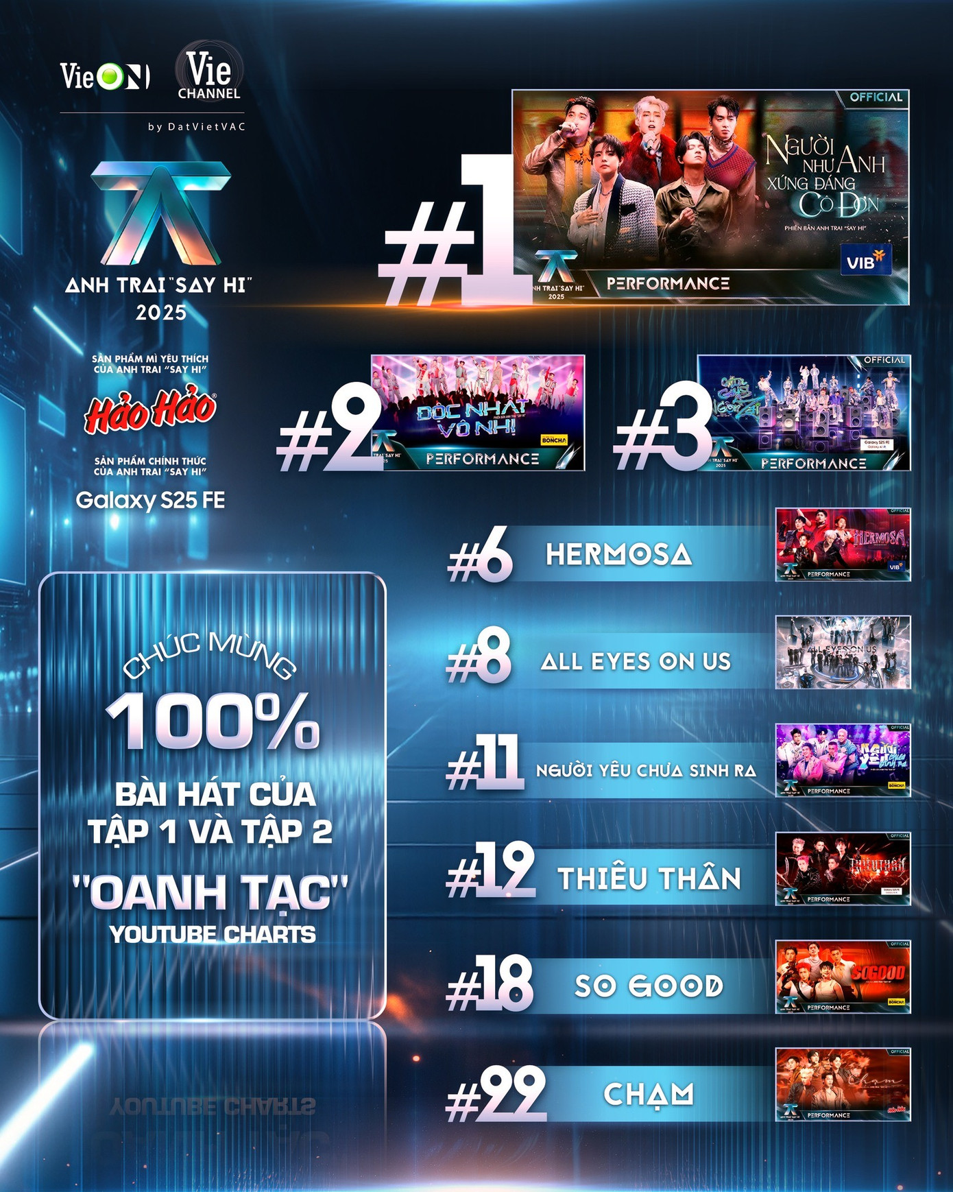 Song song với sức hút thảo luận, loạt thành tích về lượt xem cũng khiến công chúng bất ngờ: Hơn 560 triệu lượt xem được ghi nhận trên YouTube, Facebook, VieON và TikTok. Con số "khổng lồ" này không chỉ khẳng định độ phủ sóng rộng rãi của chương trình, mà còn cho thấy sức hấp dẫn ngày càng tăng của Anh Trai “Say Hi” 2025.