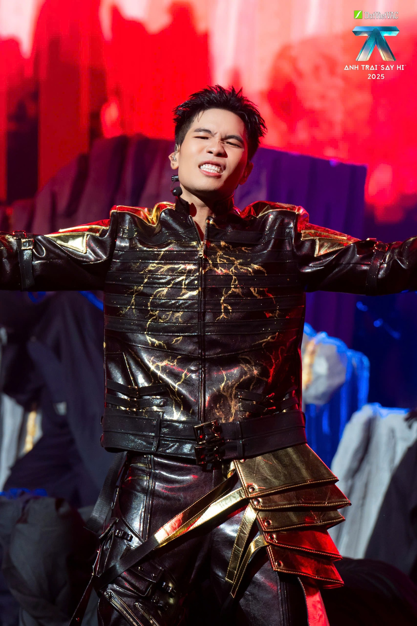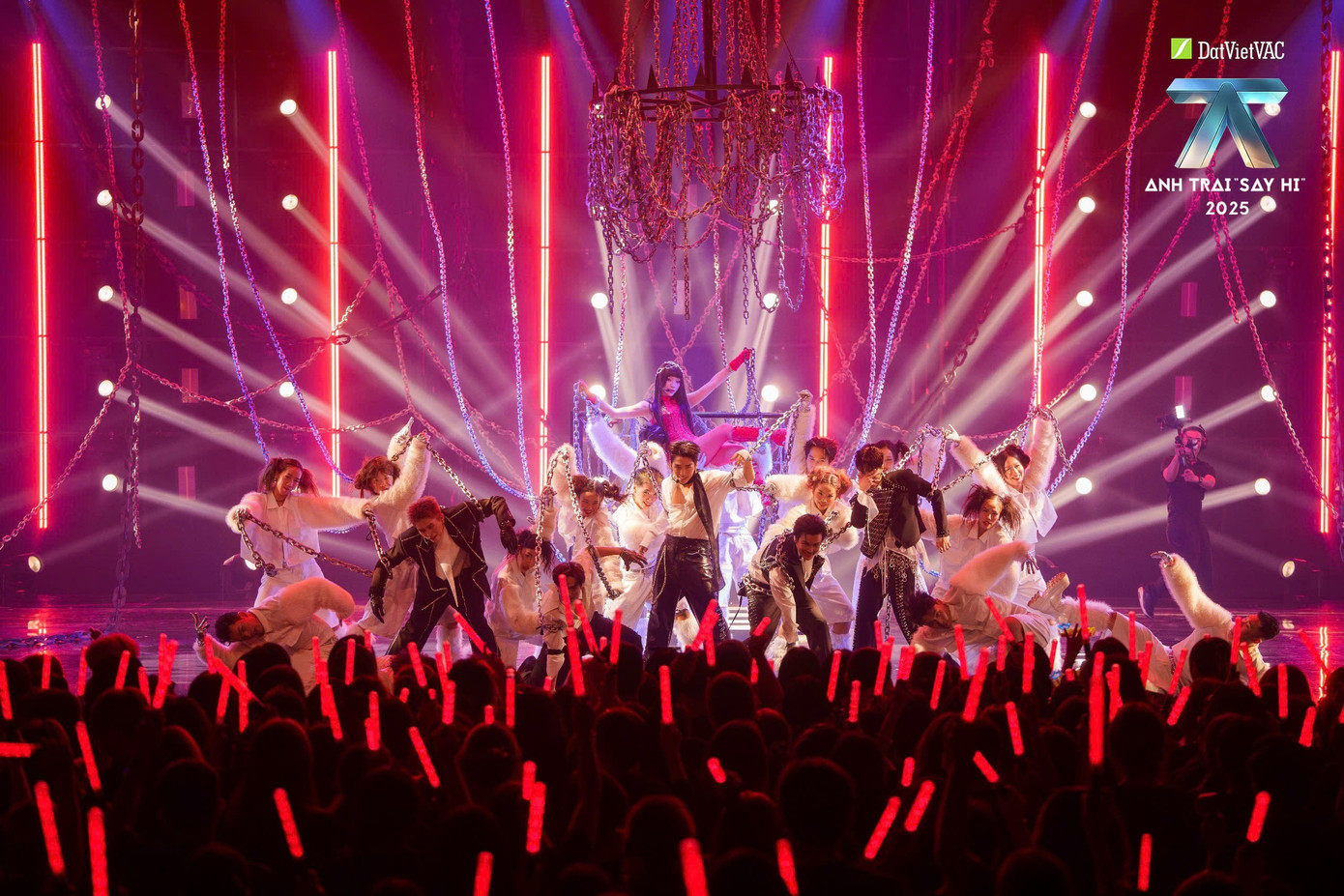 Không gian sân khấu được bao phủ bởi tấm rèm đỏ và chuỗi đèn hình xích, vừa gợi bí ẩn, vừa mang tính biểu tượng mạnh mẽ.