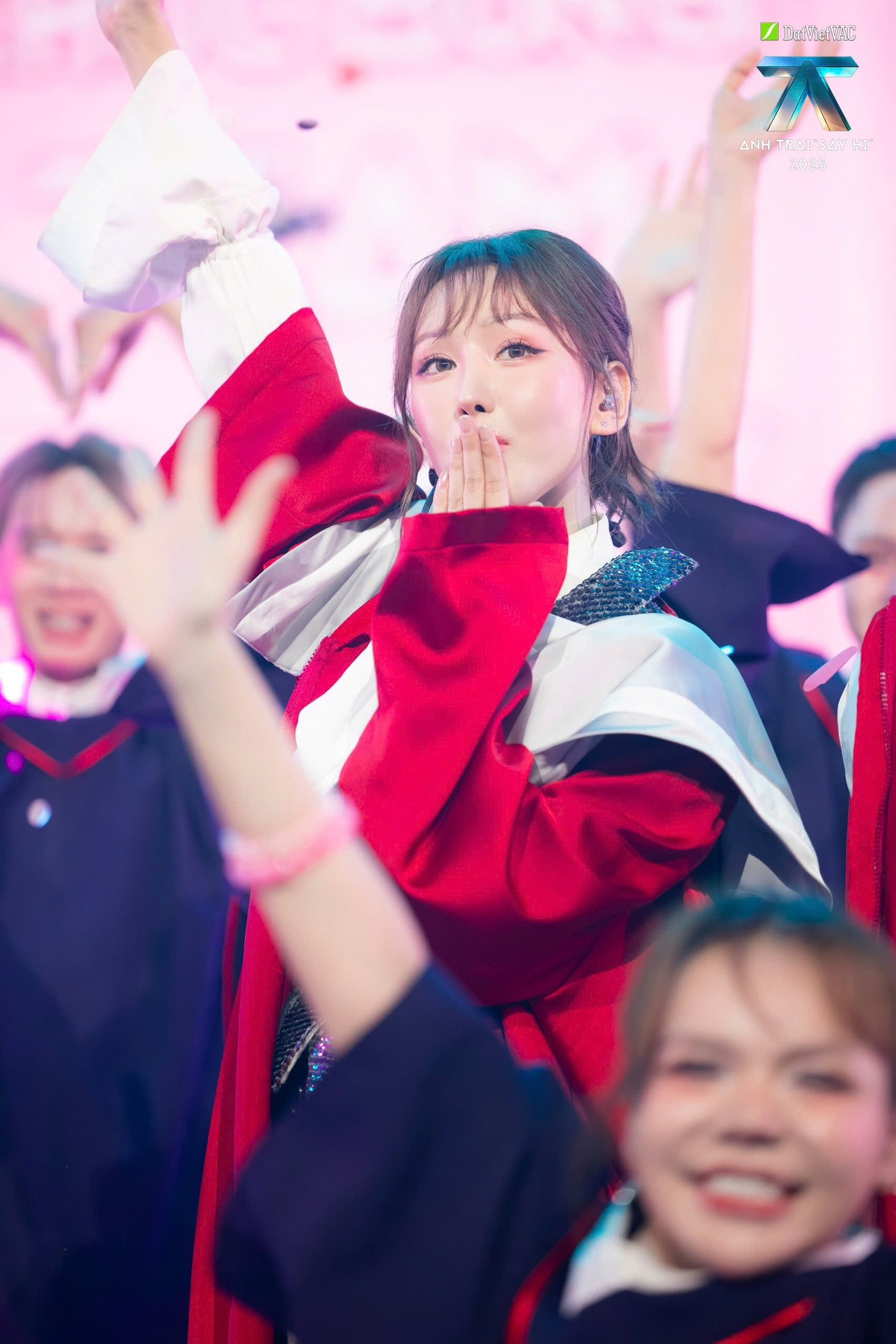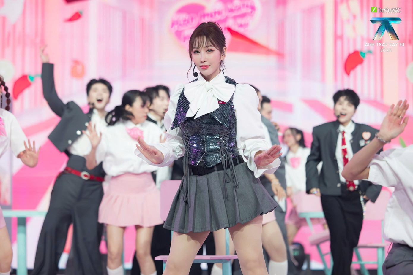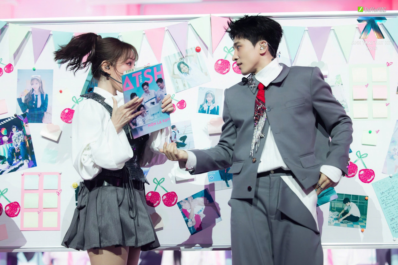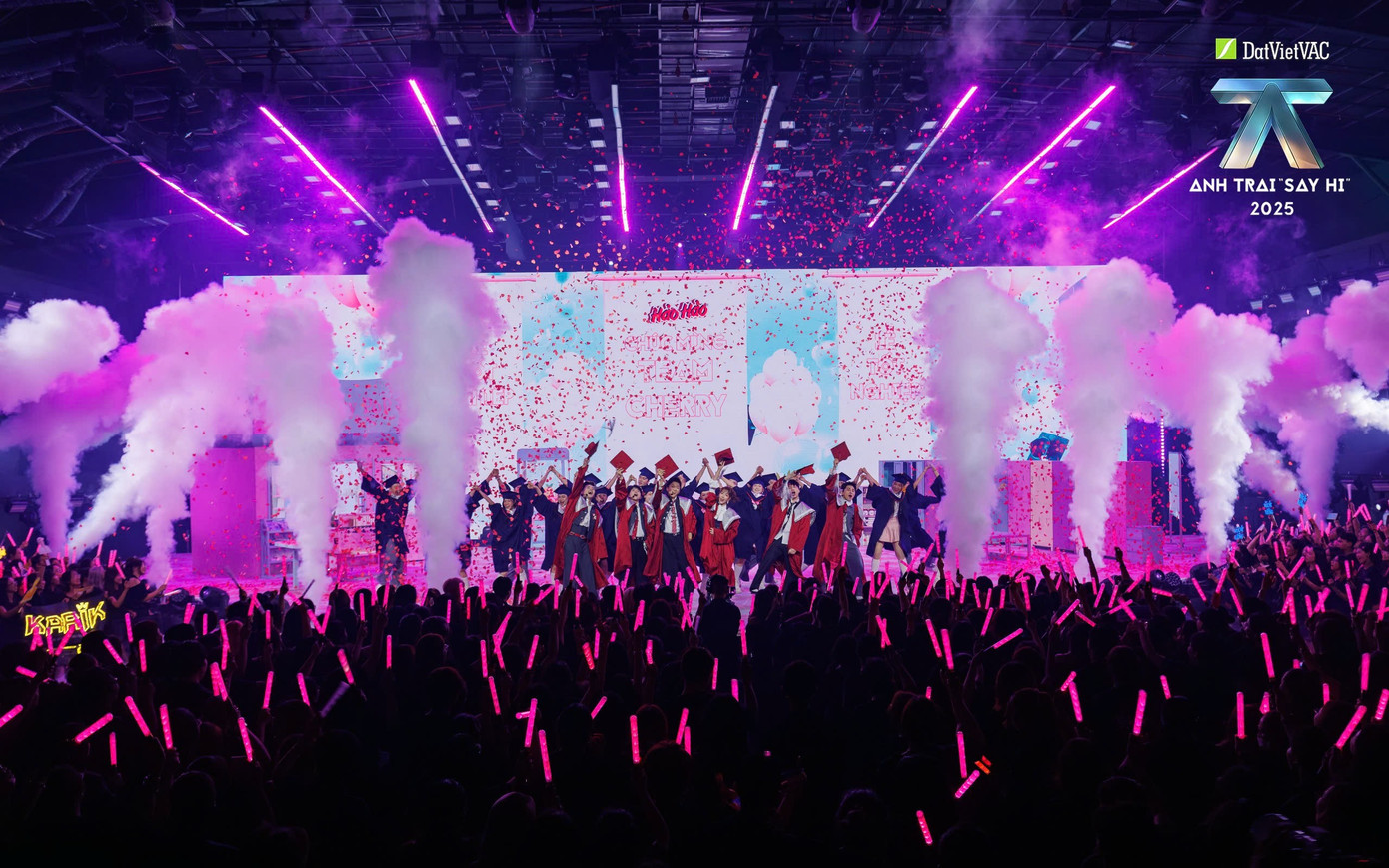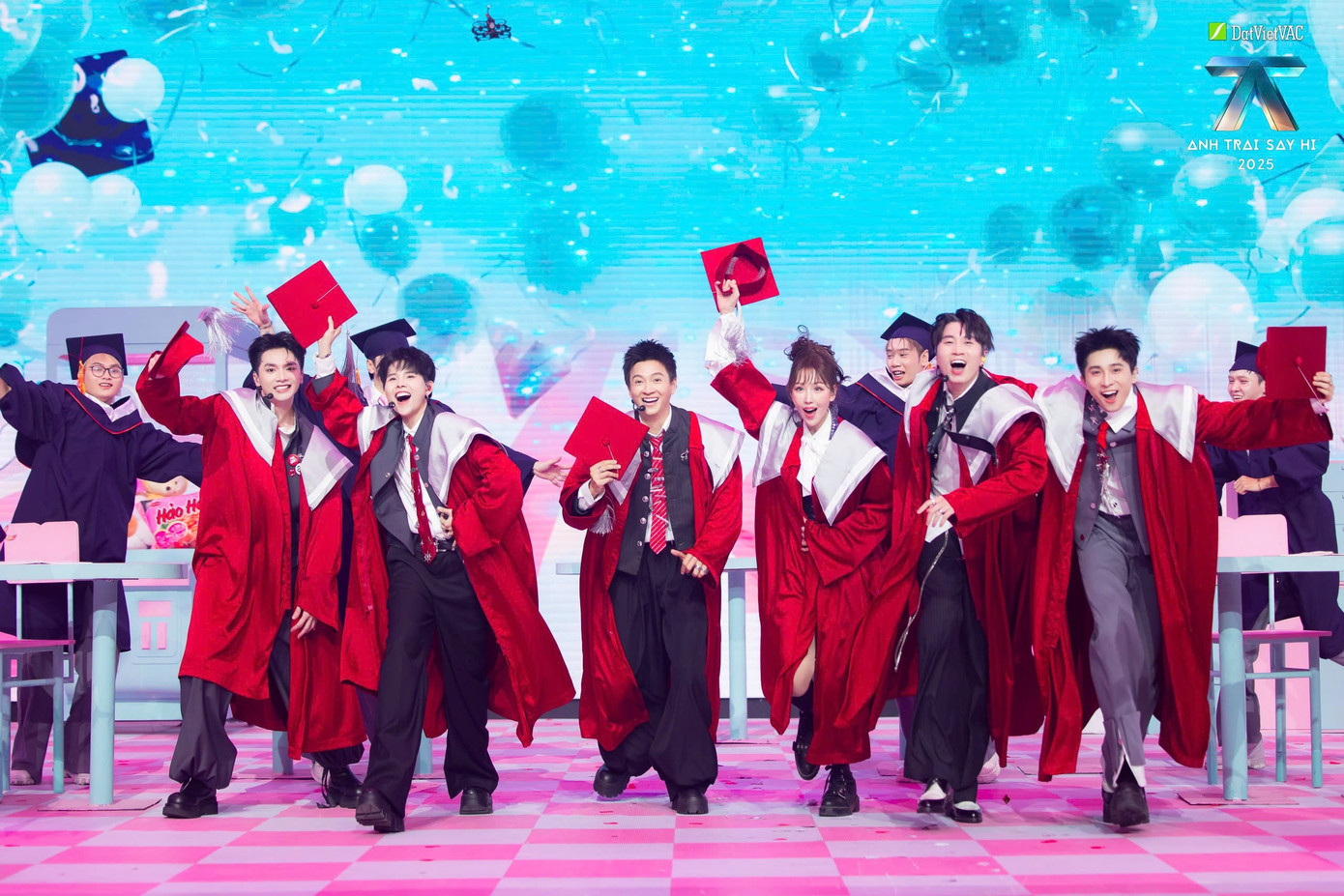 Sân khấu mở ra với không gian được phủ trong sắc hồng pastel ngọt ngào, tái hiện trọn vẹn khung cảnh học đường với những hình ảnh quen thuộc: Bàn học, bảng trắng và cả áo choàng tốt nghiệp, mưa pháo giấy,...