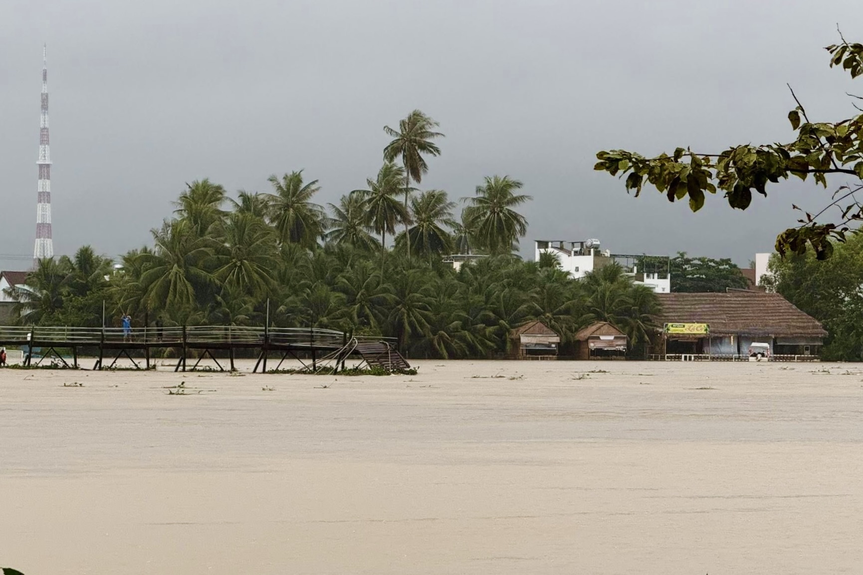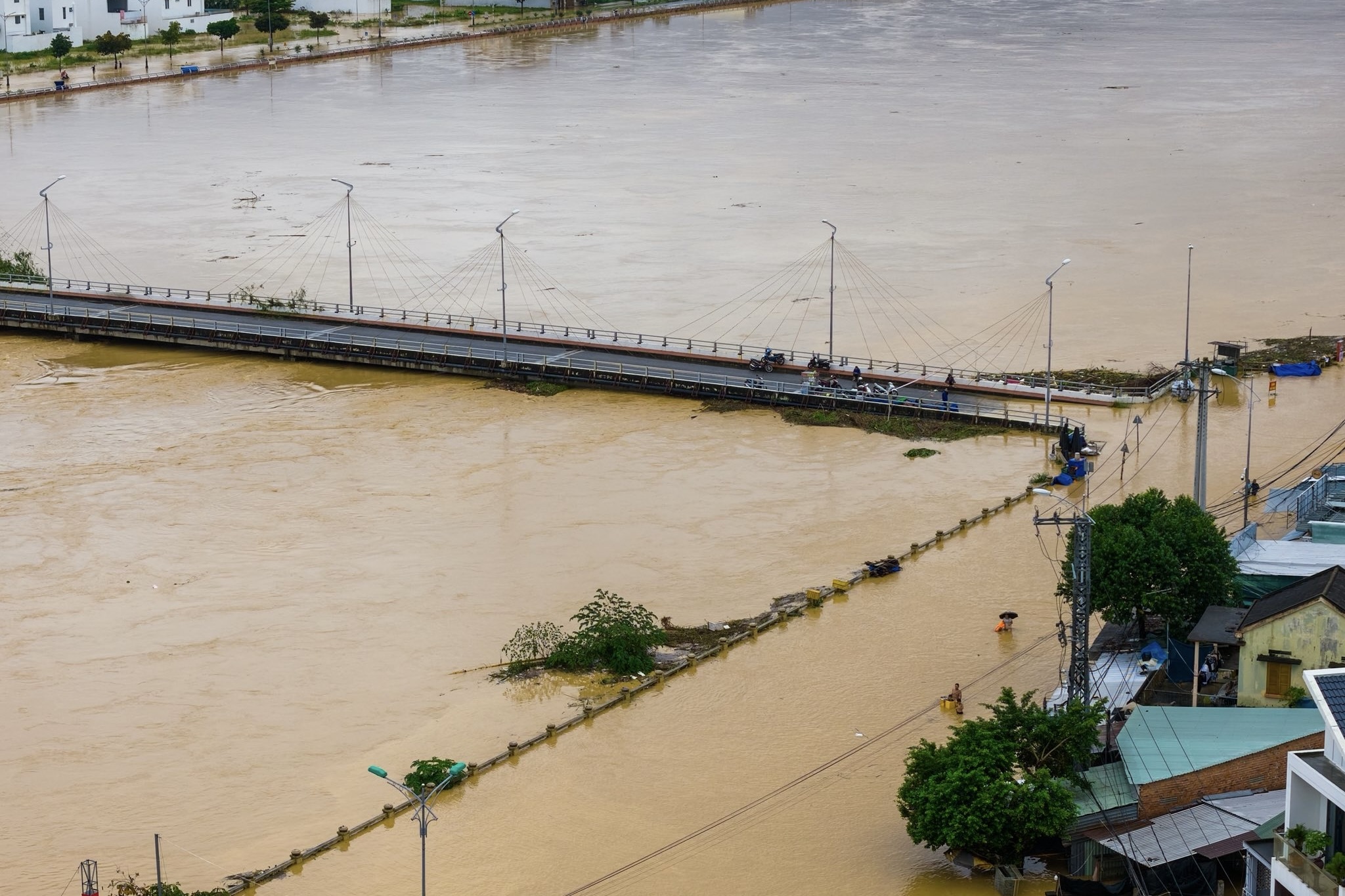 Trong khi đó, tại xã Diên Khánh, khu vực dân cư ở hai đầu cầu Thành - một trong số cây cầu huyết mạch trên địa bàn - chứng kiến cảnh ngập nặng, gần chạm mép thành cầu. Hình ảnh chụp một góc cầu lúc 16h ngày 17/11. Ảnh: Amazing Nha Trang.