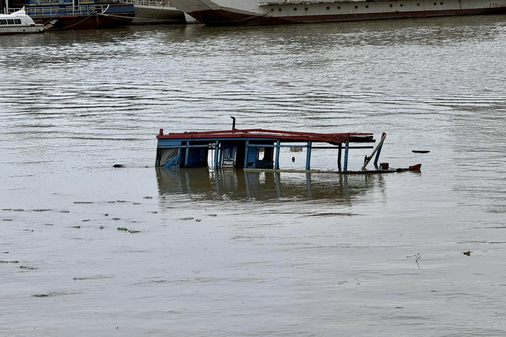 Dưới chân cầu Bình Tân, ngư dân buộc bỏ lại con thuyền ngập quá nửa thân trong trận lụt 17h chiều 17/11. Đây là cây cầu bắc qua sông Tắc kết nối người dân hai đầu đường Nguyễn Tất Thành (phường Nam Nha Trang). Ảnh: Phạm Hưng.