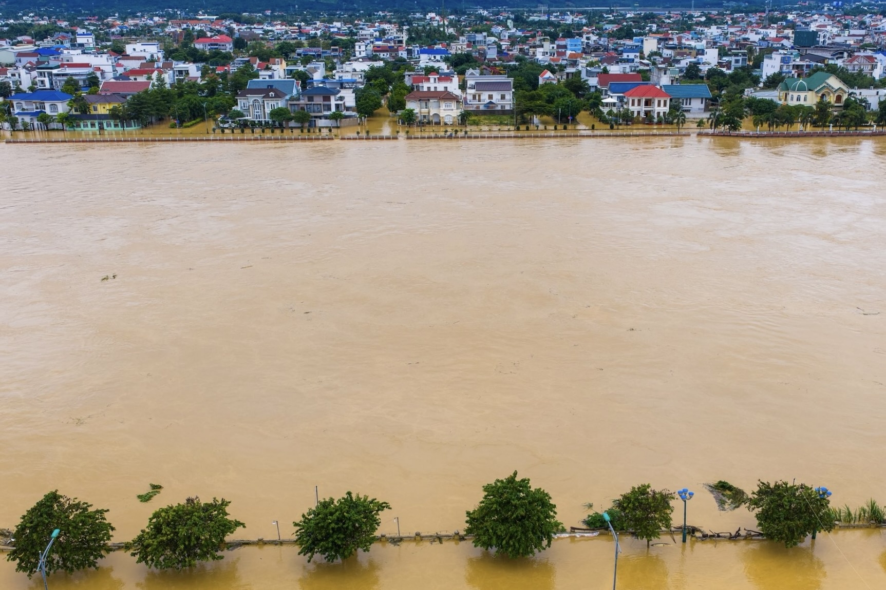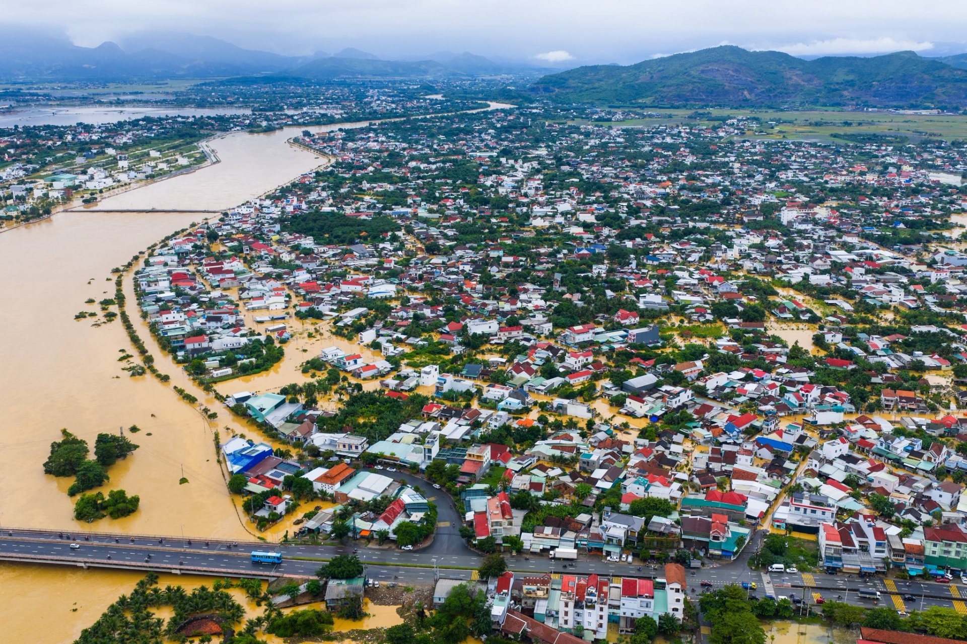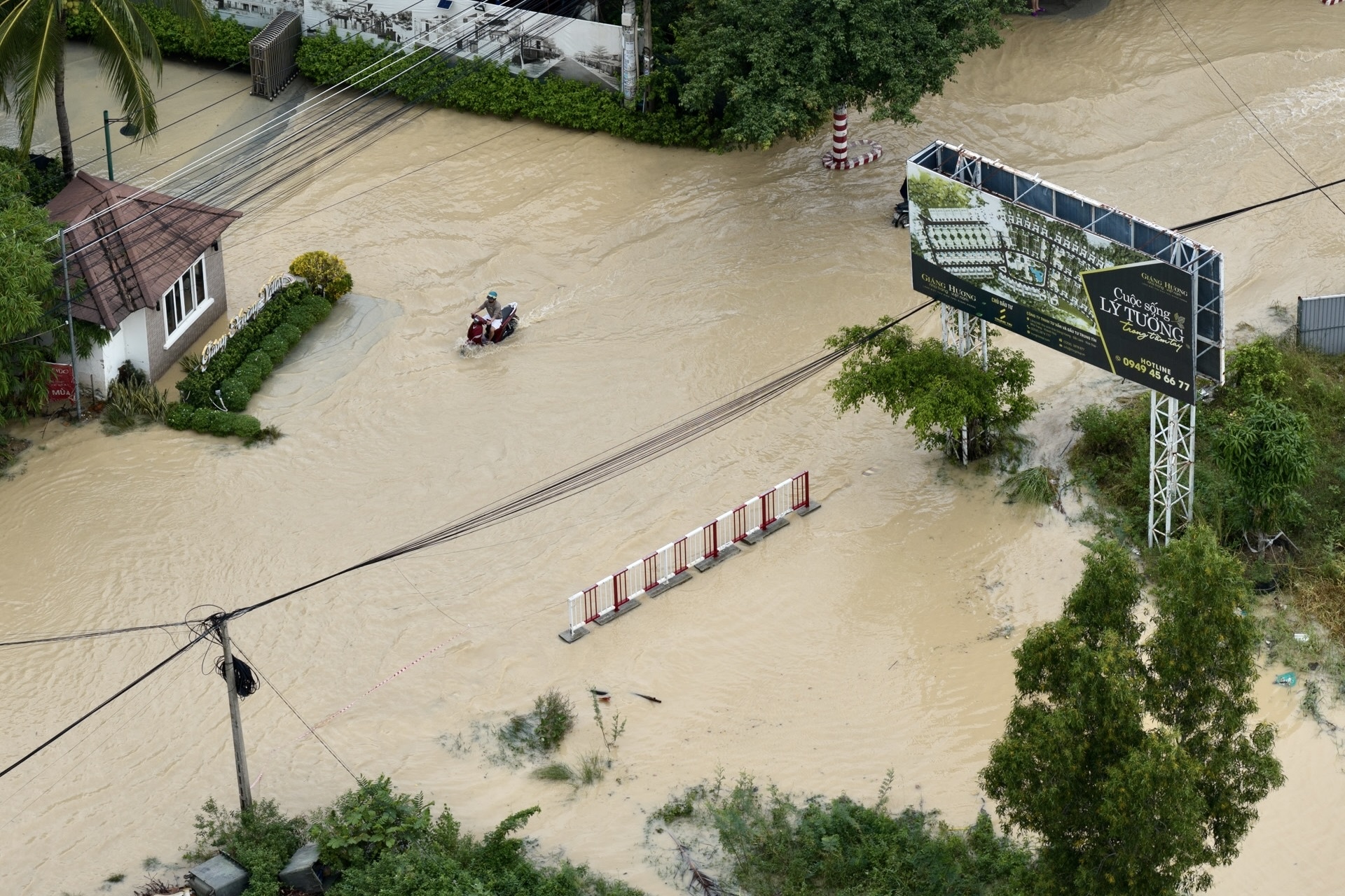 Trong cuộc họp khẩn về tình hình ngập lụt và sạt lở tại Khánh Hòa sáng 18/11, Ông Nguyễn Duy Quang, Giám đốc Sở Nông nghiệp và Môi trường Khánh Hòa, cho biết tình trạng mưa lớn vẫn diễn biến phức tạp trên địa bàn tỉnh đến ngày 19/11. Mực nước sông Cái dâng cao do lượng nước đổ về từ các hồ chứa ở thượng nguồn, đồng thời gây ngập ở nhiều khu vực như phường Tây Nha Trang, xã Diên Điền, Diên Khánh… Hình ảnh sông Cái Nha Trang từ trên cao chụp khoảng 16h ngày 17/11. Ảnh: Amazing Nha Trang.