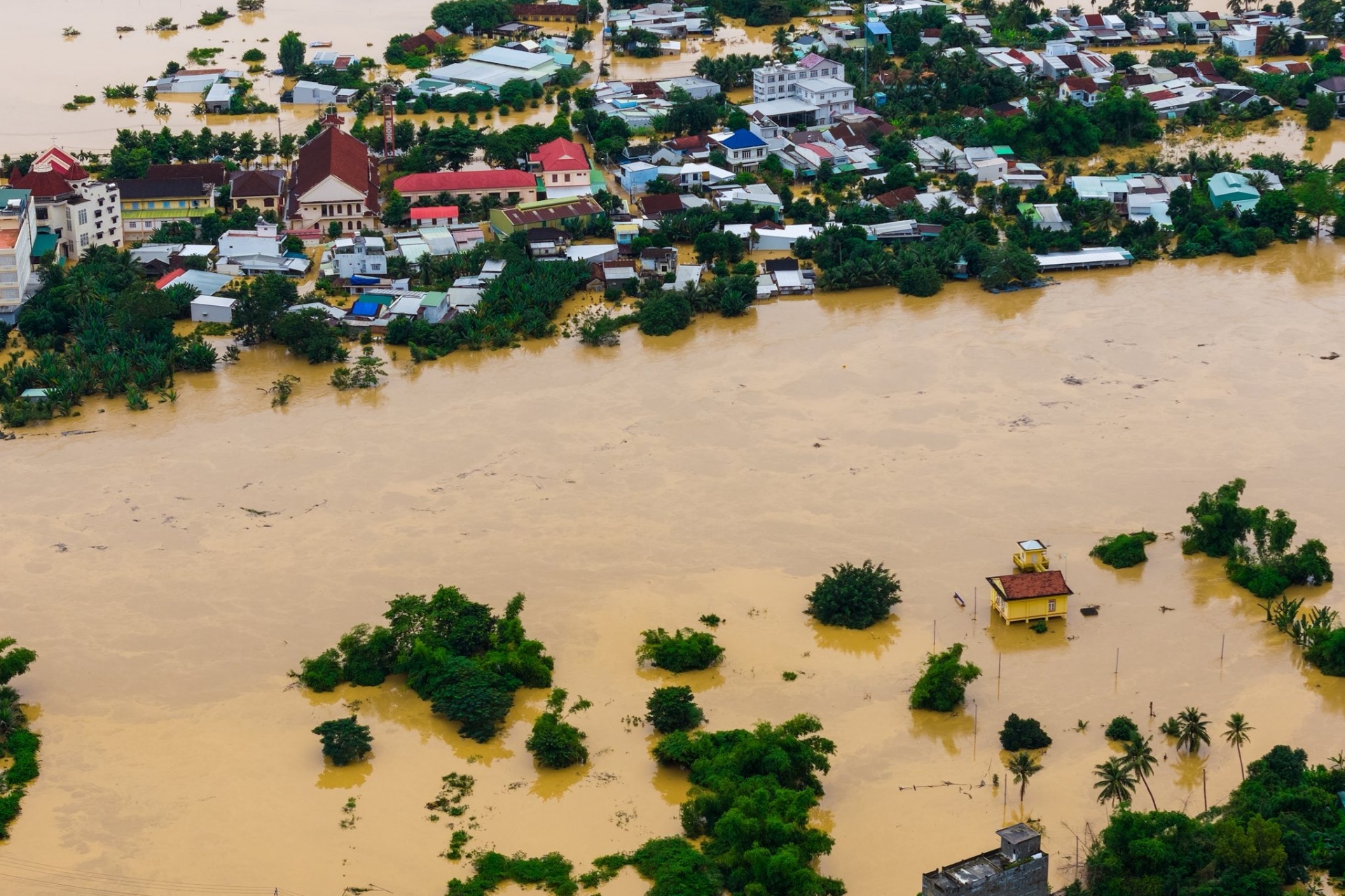 Xã Diên Điền nằm bên cạnh sông Cái có 10 thôn bị ngập, trong đó 6 thôn bị cô lập hoàn toàn. Hình ảnh chụp xã Diên Điền lúc 16h ngày 17/11. Ảnh: Amazing Nha Trang.