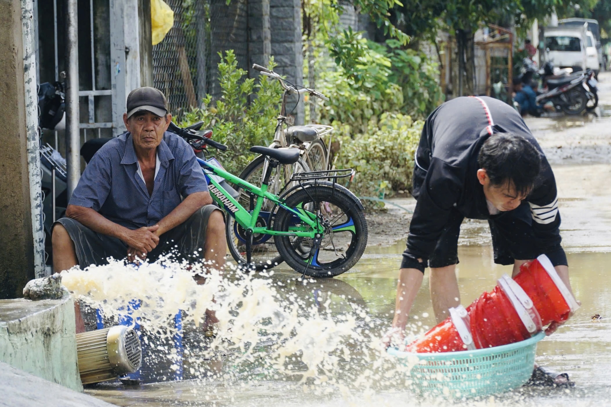 Khoảng 9h sáng 18/11, Nha Trang ngớt mưa. Người dân ở phường Tây Nha Trang (địa điểm ngập lụt nặng nhất) tranh thủ bơm nước từ trong ngõ ra ngoài. Trước đó, khu vực này ngập nặng, tắc nghẽn hệ thống thoát nước cục bộ. Ảnh: Hoài Bão.