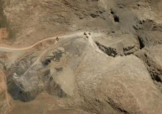Ảnh vệ tinh chụp một căn cứ tên lửa gần Khomeyn (Iran) ngày 10/4/2026 cho thấy một máy xúc nằm trên đống đổ nát chắn lối vào đường hầm, trong khi các xe tải chờ gần đó. Ảnh: Airbus