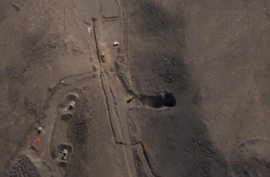 Ảnh vệ tinh cho thấy hai máy xúc bánh lốp đang được sử dụng để đào thông một lối vào đường hầm bị chặn tại một căn cứ tên lửa ở phía Nam Mahdasht, Iran vào ngày 6/3. Ảnh do Airbus cung cấp