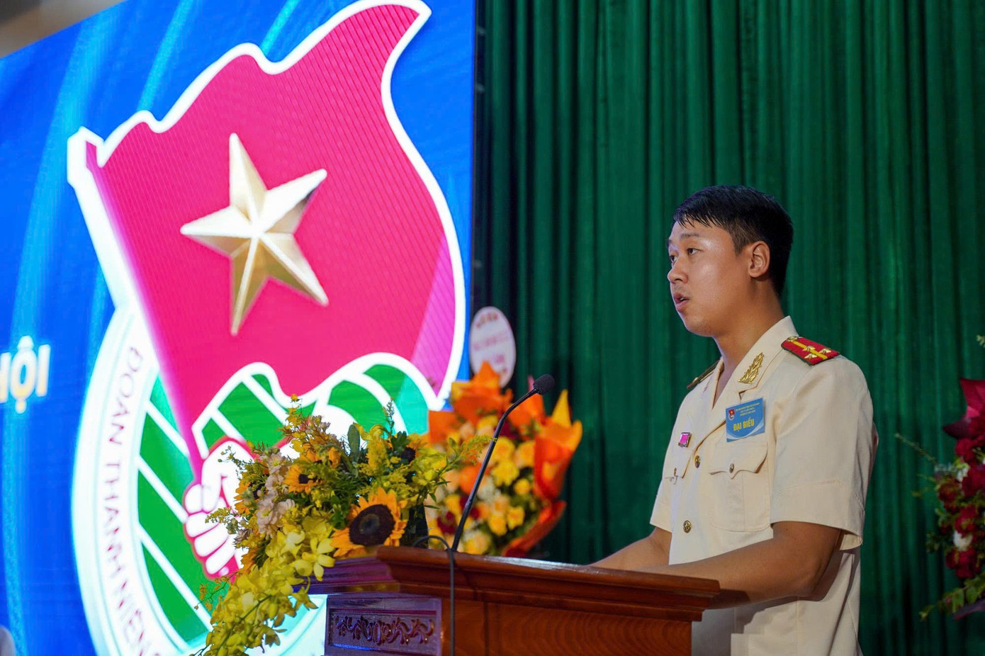 Thượng úy Vũ Văn Tùng - Bí thư Đoàn Thanh niên Cục C11 phát biểu tại Đại hội.