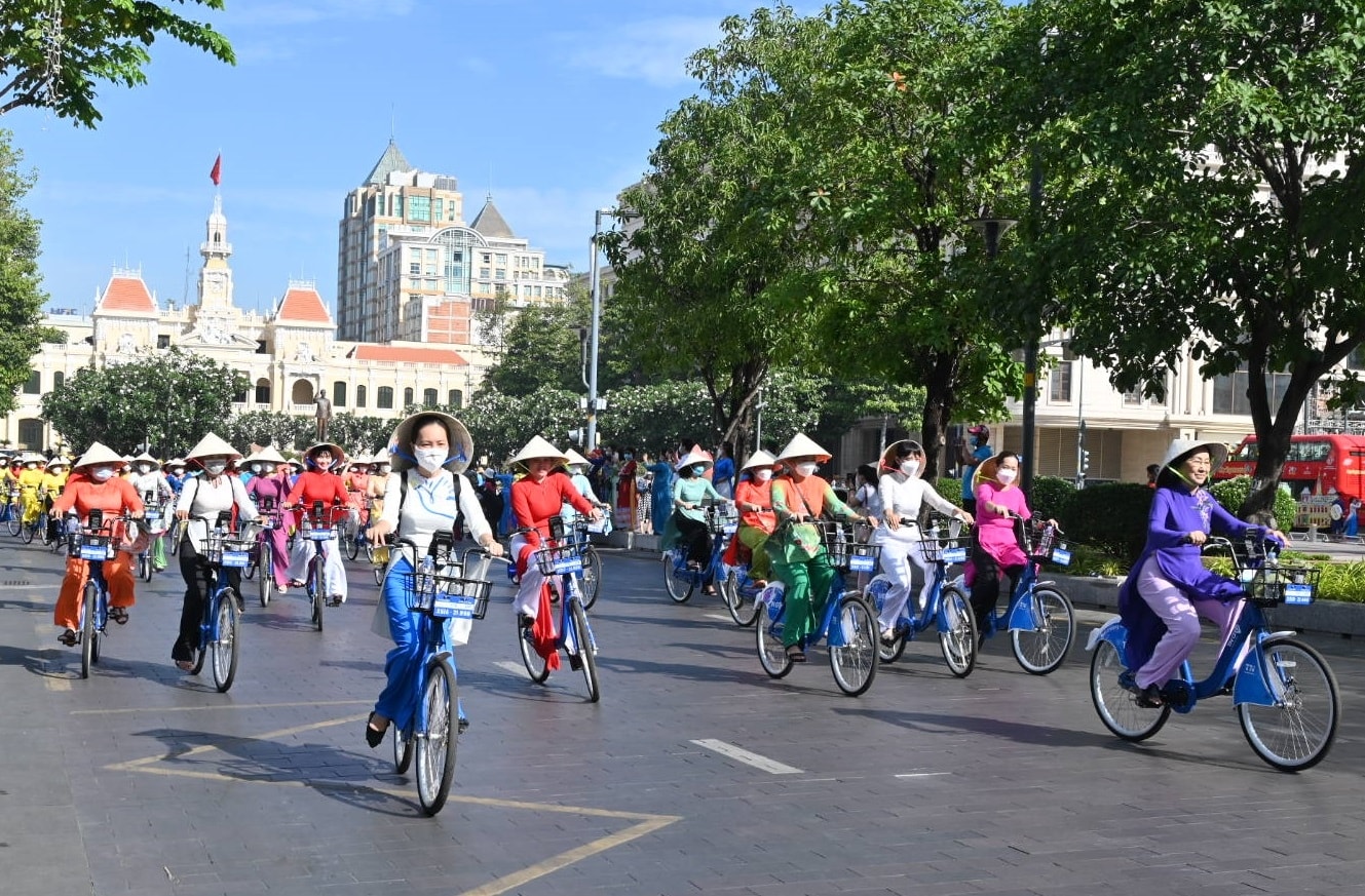 Diễu hành áo dài đi xe đạp tại Lễ hội áo dài TP.HCM 2025