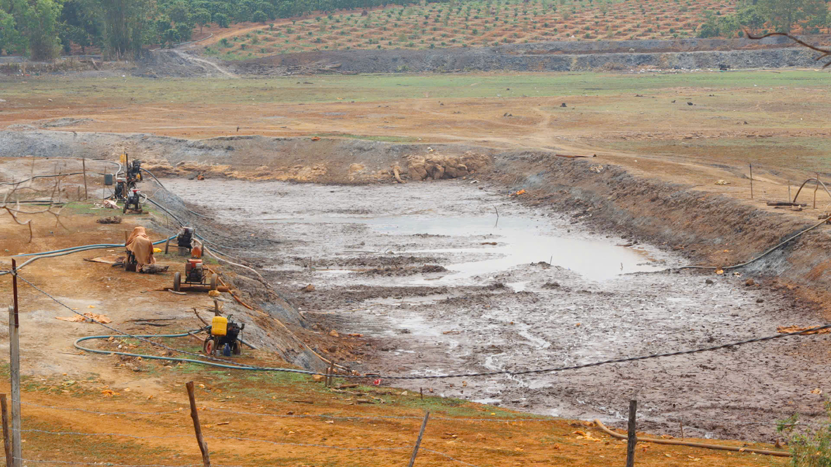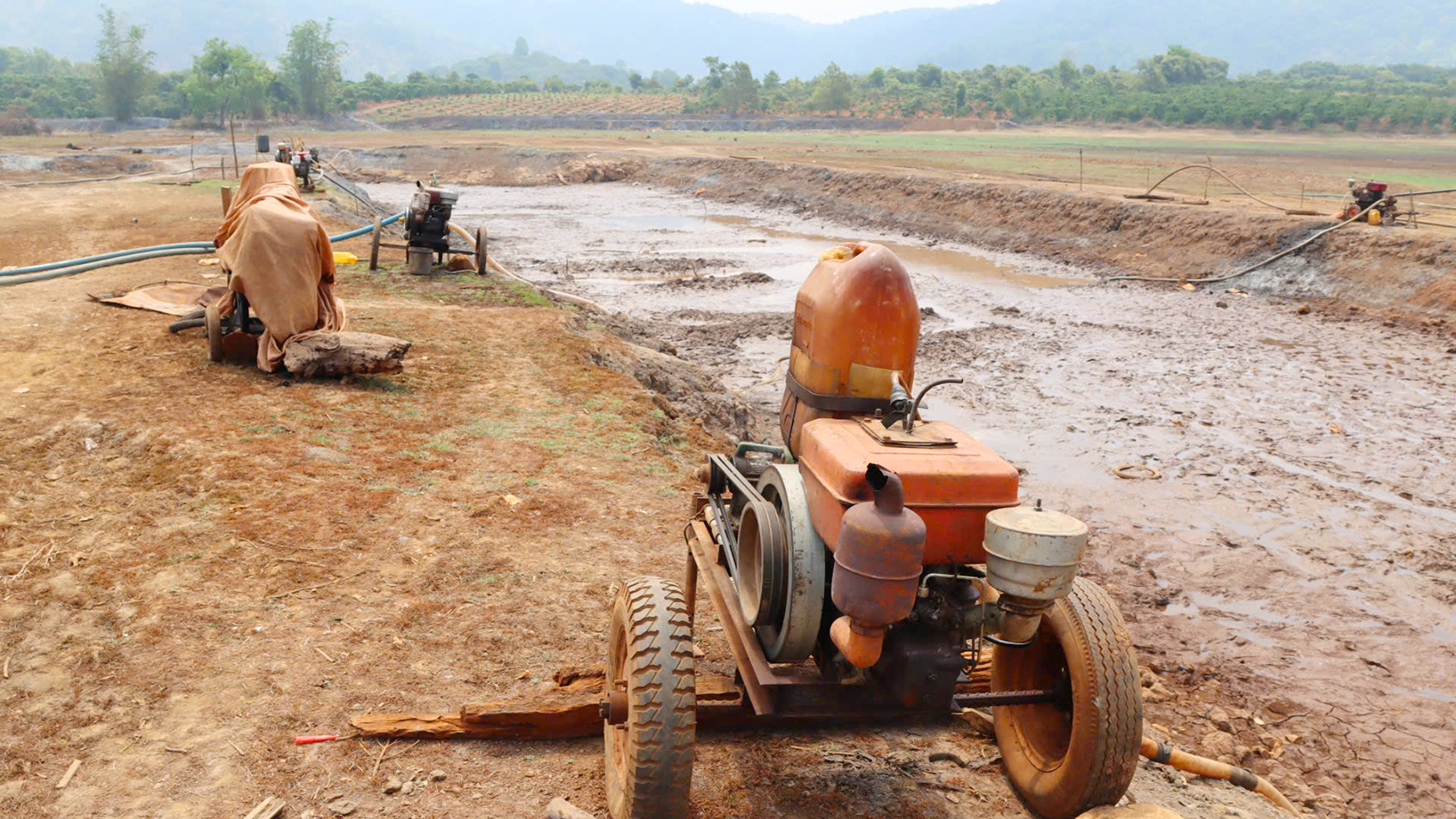 Người dân dùng máy móc sâu giữa hồ nhưng lượng nước tưới cây vẫn phập phù, mong manh.