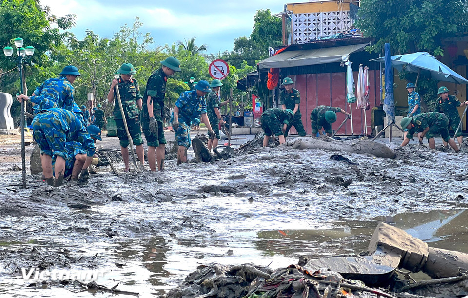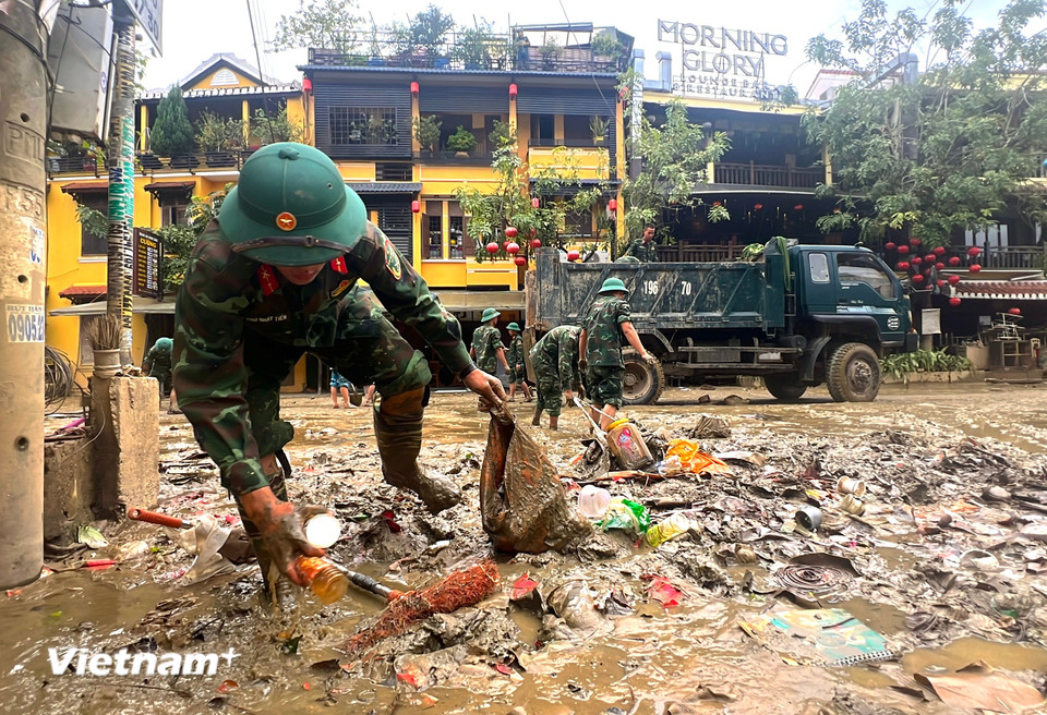 Hơn 400 cán bộ, chiến sỹ chia thành nhiều tổ đội phối hợp hiệp đồng theo tuyến phố, hót bùn, thu gom rác ngay tại hiện trường. (Ảnh: Thanh Phong/Vietnam+)