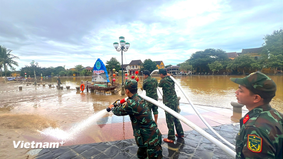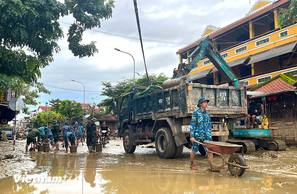 Ngay từ sáng sớm, hàng trăm cán bộ chiến sỹ đã được Quân đội huy động hót dọn bùn đất tại khu vực phố cổ Hội An, thành phố Đà Nẵng. (Ảnh: Thanh Phong/Vietnam+)