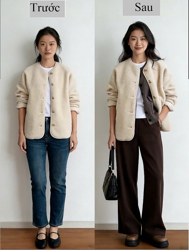 Áo lông sáng màu rất dễ mặc nhưng cũng dễ gây cảm giác “hiền”. Cách khắc phục nằm ở việc phối cùng quần ống rộng tông trầm và giữ tổng thể trong bảng màu ấm.