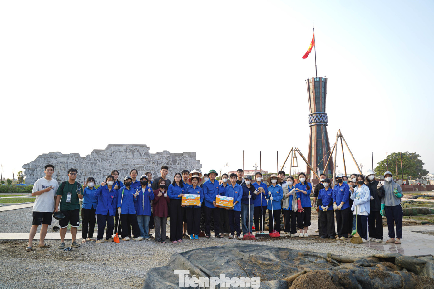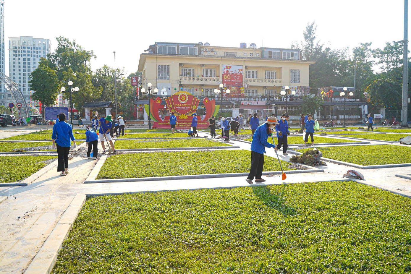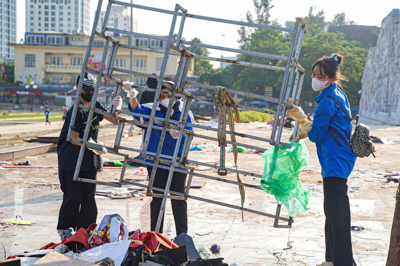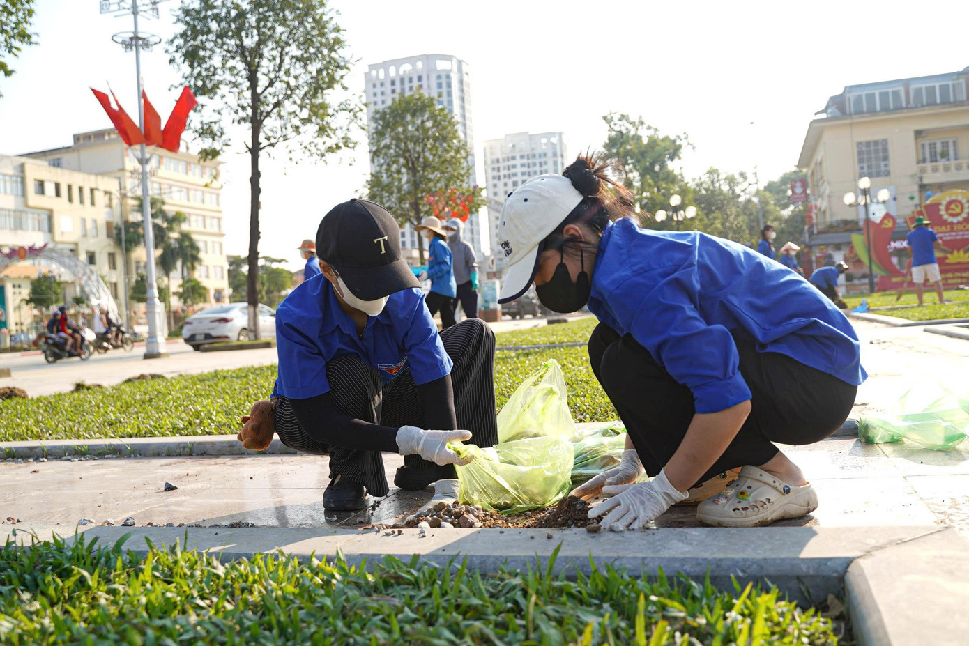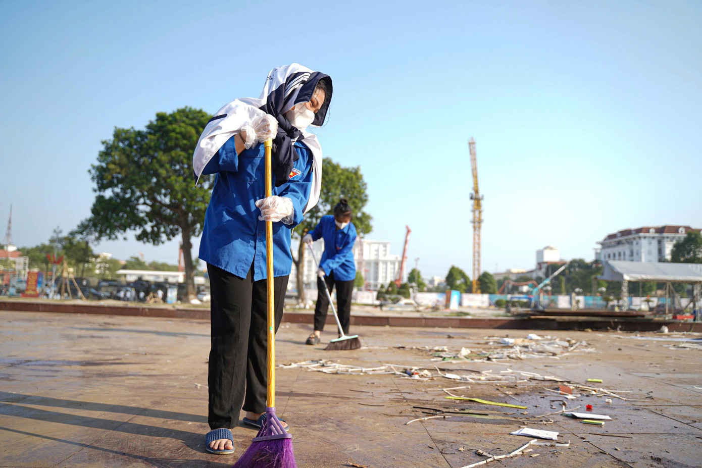 Các bạn trẻ có mặt tại quảng trường Võ Nguyên Giáp thuộc phường Phan Đình Phùng để tiến hành dọn bùn đất, thu gom rác thải và làm sạch môi trường...