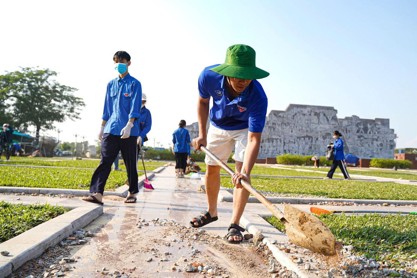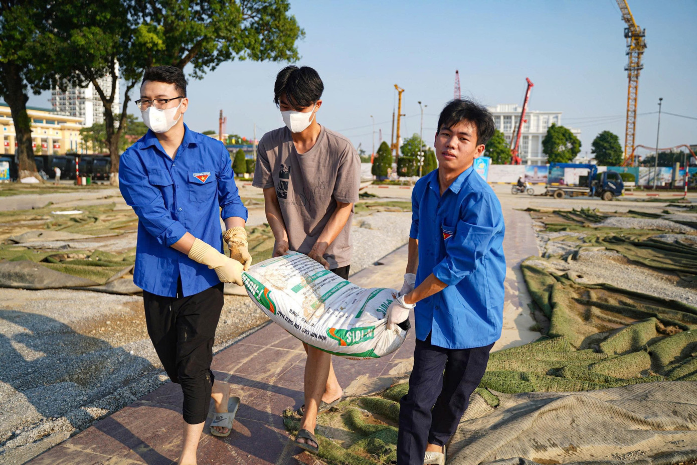 Các đoàn viên dọn đất đá tại khu vực quảng trường.