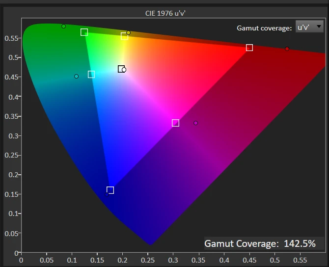 Điểm mạnh lớn nhất của màn hình là khả năng tái tạo màu sắc. Các kết quả đo lường cho thấy Q27G4ZD bao phủ 99% không gian màu Adobe RGB, 142.5% sRGB và 99.1% DCI-P3. Đây là những con số xuất sắc, đặc trưng của công nghệ OLED, đảm bảo màu sắc sống động và chính xác. Màn hình cũng đạt chứng nhận DisplayHDR True Black 400 và tương thích Nvidia G-Sync để giảm thiểu hiện tượng xé hình.