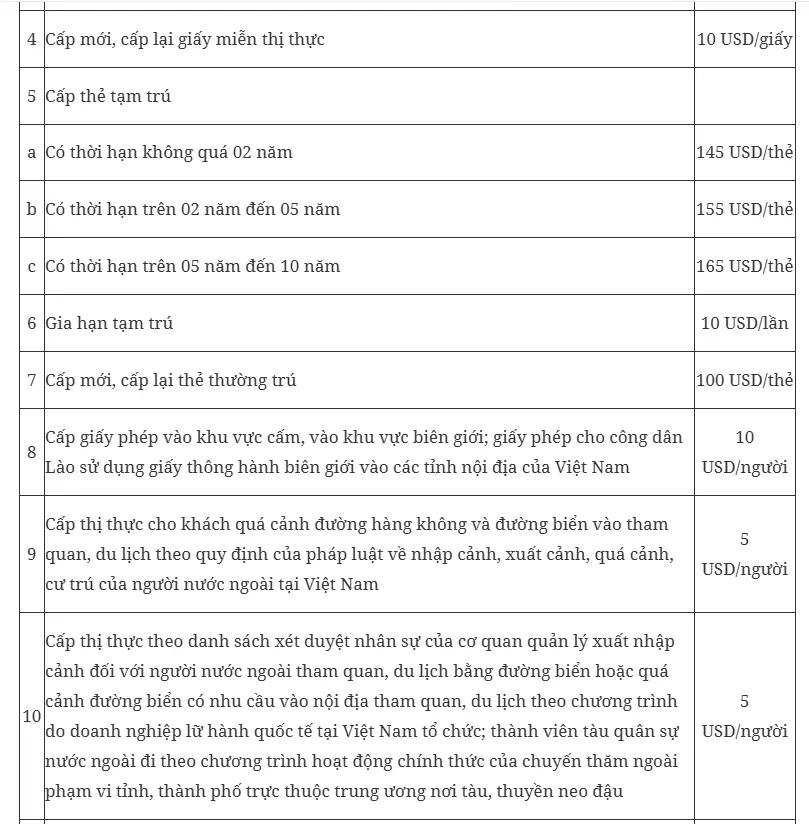 Phí cấp thị thực và các giấy tờ khác có giá trị xuất cảnh, nhập cảnh, cư trú cho người nước ngoài: