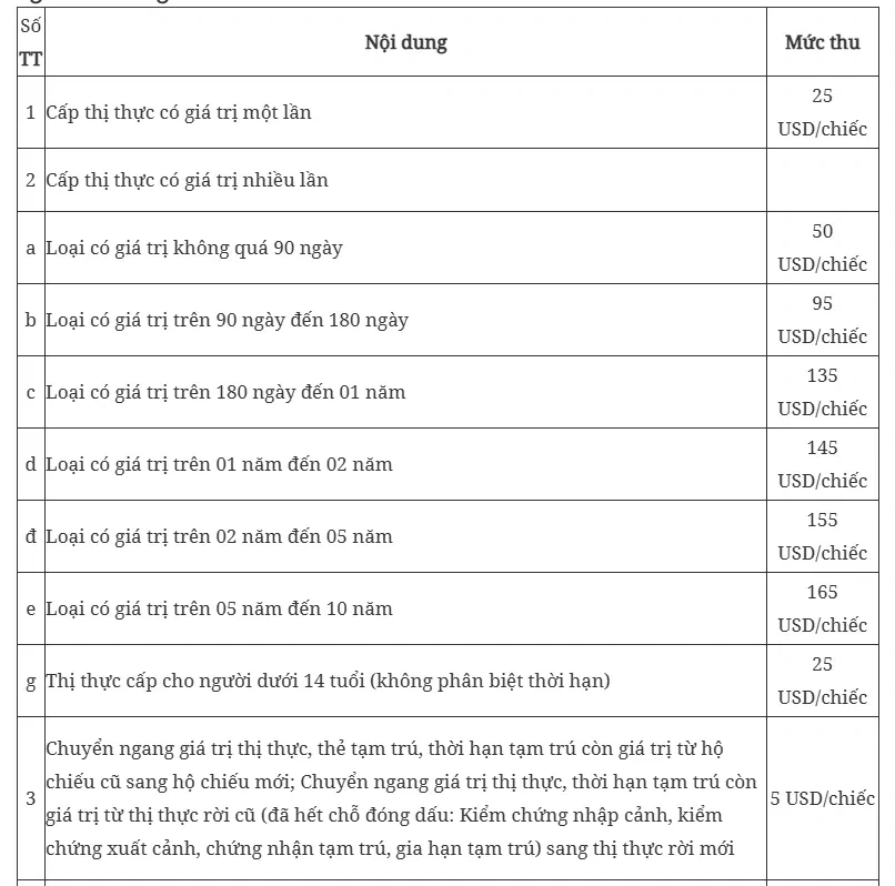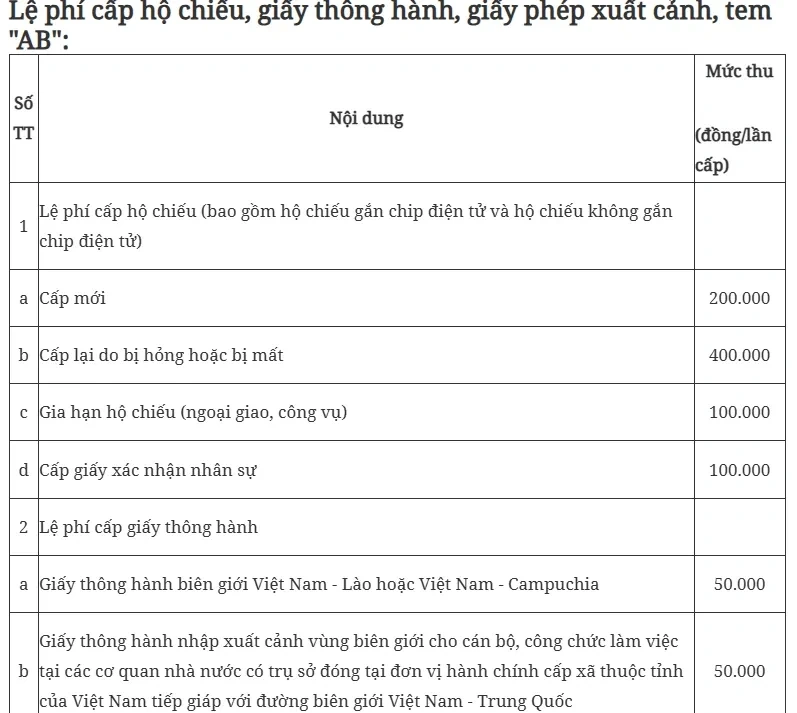 Theo quy định, các khoản thu áp dụng đối với công dân Việt Nam, người nước ngoài và các tổ chức, cá nhân khi thực hiện thủ tục cấp hộ chiếu, thị thực, giấy thông hành và các giấy tờ liên quan đến xuất nhập cảnh.