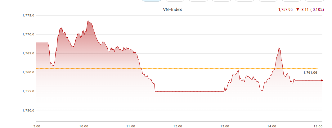 Trên sàn thành phố Hồ Chí Minh, thị trường chỉ diễn biến tích cực trong phần lớn thời gian buổi sáng. Đến hơn 11h, áp lực bán gia tăng khiến chỉ số VN-Index rơi xuống dưới mức tham chiếu. Kết thúc phiên sáng, VN-Index tạm dừng tại 1.757,08 điểm, giảm 3,98 điểm.