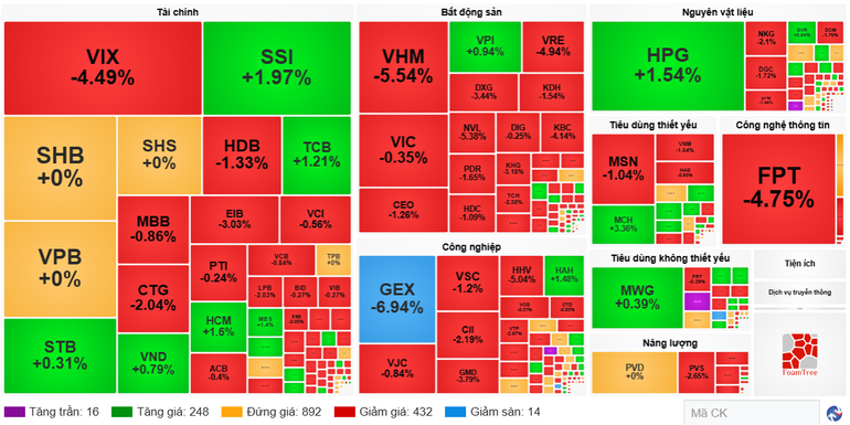Ở chiều ngược lại, các mã tác động tiêu cực làm giảm 12,86 điểm của VN-Index gồm: VHM, FPT, CTG, VCB, GAS, GEE, VRE, LPB, VIC, GEX.