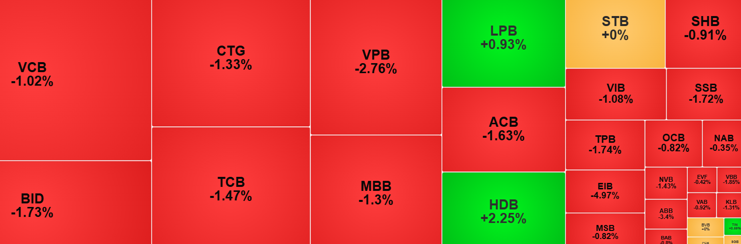 Hầu hết nhóm cổ phiếu ngân hàng giảm giá. Ảnh chụp qua màn hình