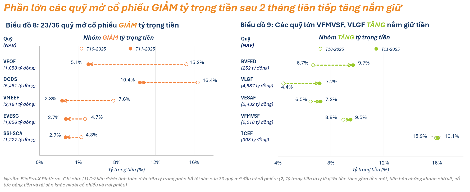 Áp lực rút ròng tại nhóm quỹ cổ phiếu hạ nhiệt rõ rệt, giảm 67,5% so với cùng kỳ xuống còn gần 982 tỷ đồng, mức thấp nhất kể từ tháng 1/2025. Nhóm quỹ cổ phiếu ghi nhận dòng tiền rút ròng giảm mạnh ở cả 3 nhóm (quỹ mở, quỹ đóng, ETF). Nhiều quỹ mở cổ phiếu tăng giải ngân. Cụ thể, có 23/36 quỹ mở cổ phiếu giảm tỷ trọng tiền trong tháng 11, đảo chiều so với tháng 10. Phần lớn các quỹ lớn đều giảm nắm giữ tiền, cho thấy tâm lý bớt phòng thủ hơn của các nhà quản lý quỹ. FPT tiếp tục dẫn đầu danh sách các cổ phiếu được quỹ mua ròng (theo khối lượng) trong tháng 11/2025. Nhóm bất động sản (NLG, DIG, KDH, HDG) cũng ghi nhận lực mua ròng lan tỏa. Ngược lại, mã HPG, ngân hàng có vốn hóa lớn (TCB, STB, CTG, VCB) và chứng khoán (SSI, BSI) nằm trong nhóm cổ phiếu bị các quỹ bán ròng mạnh.