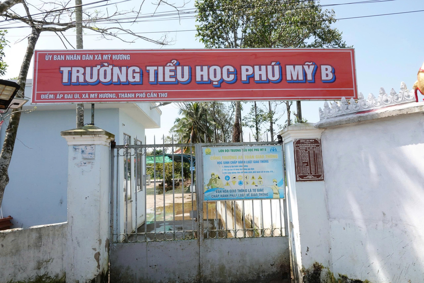 Đường về ấp Đai Úi (trái) và Trường Tiểu học Phú Mỹ B (phải) - ngôi trường đầu tiên được lập tại địa phương, trước đây nằm trong khuôn viên chùa.