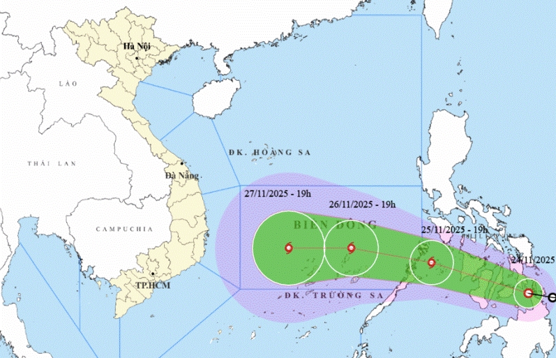 Trong khoảng đêm 26-28/11, khu vực Giữa Biển Đông và vùng biển phía Bắc khu vực Nam Biển Đông (bao gồm vùng biển phía Bắc đặc khu Trường Sa) có khả năng chịu tác động của gió mạnh cấp 10-11, giật cấp 14. Tàu thuyền hoạt động trong các vùng nguy hiểm nói trên đều có khả năng chịu tác động của dông, lốc, gió mạnh, sóng lớn.