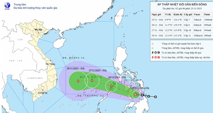 Dự báo, đến đêm mai (26/11), áp thấp nhiệt đới di chuyển với tốc độ nhanh khoảng 20 - 25 km/h, có khả năng đi vào Biển Đông. Và trên vùng biển phía Đông Nam khu vực Giữa Biển Đông có khả năng mạnh lên thành bão. Sức gió mạnh cấp 8, giật cấp 10.