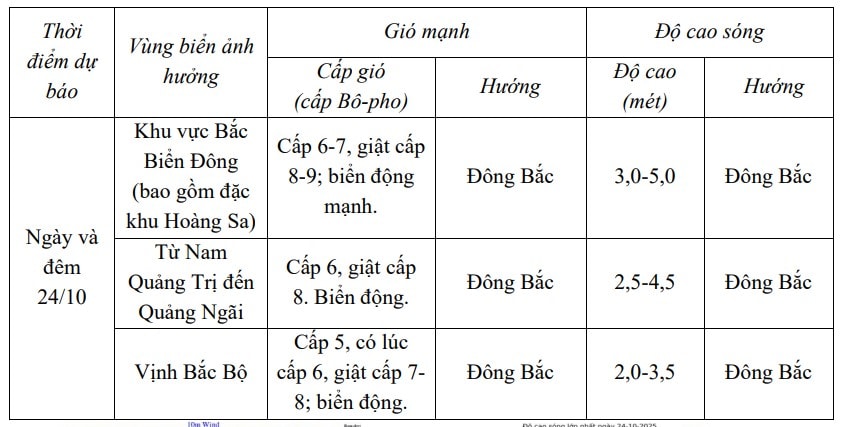 Cảnh báo, ngày và đêm 25/10 tại vùng biển phía Bắc khu vực Bắc Biển Đông có gió Đông Bắc mạnh cấp 6, có lúc cấp 7, giật cấp 8-9, biển động mạnh, sóng biển cao 3,0-5,0m.