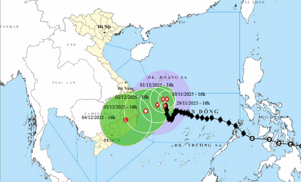 Khoảng 16h ngày 30/11, bão số 15 duy trì cường độ cấp 9, giật cấp 11, quần thảo vùng biển phía Tây Bắc khu vực giữa Biển Đông, cách bờ biển phía Đông các tỉnh Gia Lai, Đắk Lắk khoảng 340km về phía Đông, tiếp tục di chuyển theo hướng Bắc với tốc độ rất chậm, khoảng 3km/h.