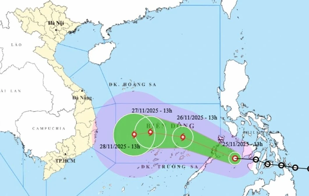 Dự báo đến 13h ngày 26/11, áp thấp nhiệt đới sẽ đi vào Biển Đông, tiếp tục di chuyển theo hướng Tây Tây Bắc với tốc độ 20-25 km/h và có khả năng mạnh lên thành bão với cường độ cấp 9, giật cấp 11.