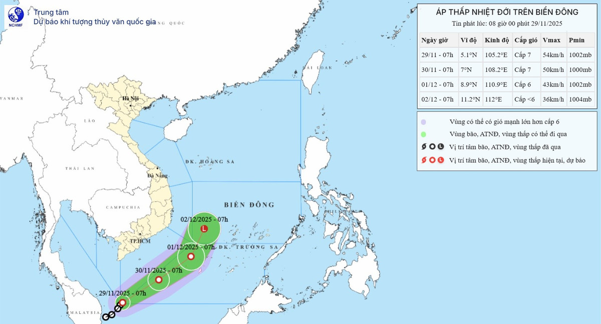 Dự báo trong 24 giờ tới, áp thấp nhiệt đới di chuyển theo hướng đông đông bắc, tốc độ khoảng 15km/giờ. Đến 7 giờ ngày 30/11, vị trí tâm ở khoảng 7 độ vĩ bắc; 108,2 độ kinh đông, trên vùng biển phía tây nam khu vực Nam Biển Đông. Cường độ cấp 7, giật cấp 9. Vùng nguy hiểm ở phía nam vĩ tuyến 8,5 độ vĩ bắc; từ 104 đến 109 độ kinh đông. Cấp độ rủi ro thiên tai cấp 3 đối với vùng biển phía tây nam khu vực Nam Biển Đông.