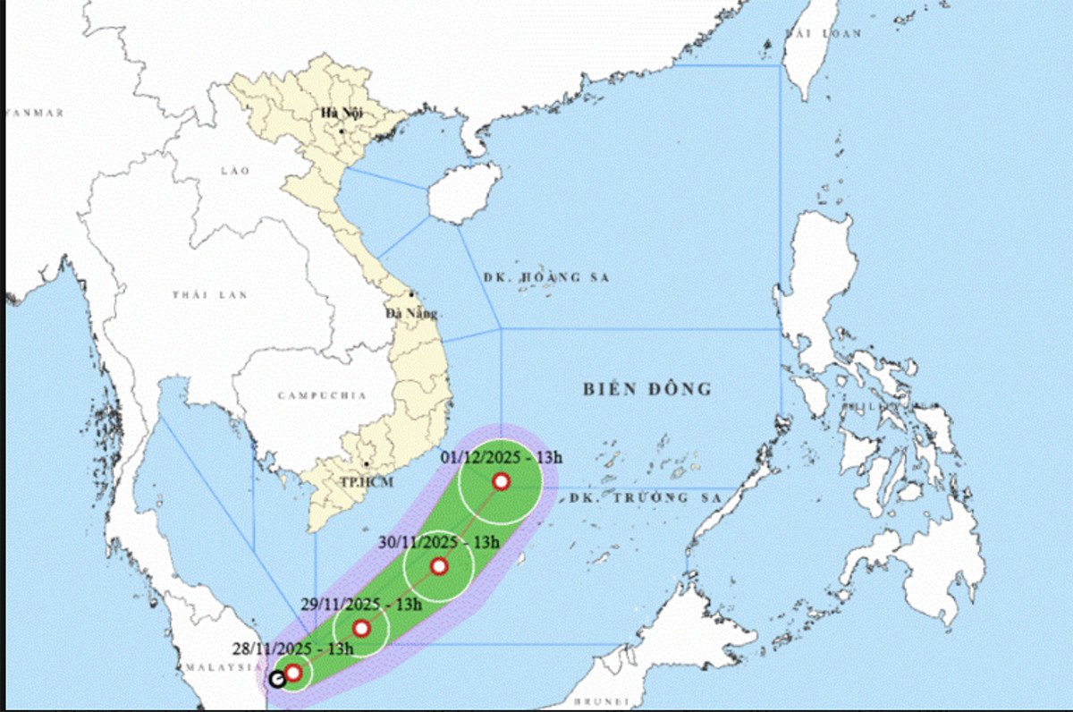 Dự báo đến 13h ngày 29/11, áp thấp nhiệt đới khả năng đi vào vùng biển phía Tây Nam khu vực Nam Biển Đông, di chuyển theo hướng Đông Bắc, mỗi giờ đi được khoảng 15km. Sức gió mạnh nhất vùng gần tâm áp thấp mạnh cấp 7, giật cấp 9.