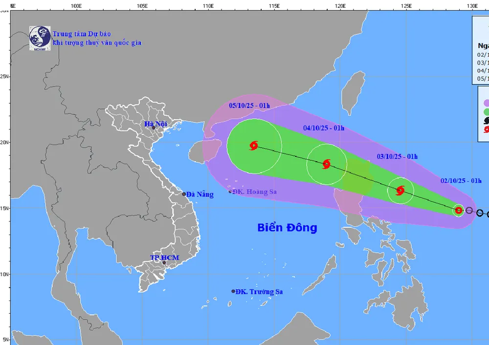 Theo Trung tâm Dự báo Khí tượng thủy văn quốc gia, rạng sáng 2-10, vị trí tâm áp thấp nhiệt đới ở vào khoảng 14,8 độ Vĩ Bắc; 129,0 độ Kinh Đông, trên vùng biển phía Đông Philippines.