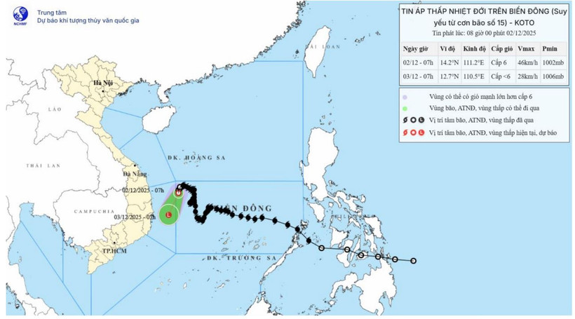 Theo Trung tâm Dự báo khí tượng thủy văn quốc gia, hồi 7 giờ sáng 2/12, vị trí tâm áp thấp nhiệt đới ở vào khoảng 14,2 độ vĩ bắc; 111,2 độ kinh đông, trên vùng biển phía tây bắc khu vực giữa Biển Đông. Sức gió mạnh nhất vùng gần tâm áp thấp nhiệt đới mạnh cấp 6 (39-49km/giờ), giật cấp 8. Di chuyển chậm theo hướng nam tây nam khoảng 5km/giờ.