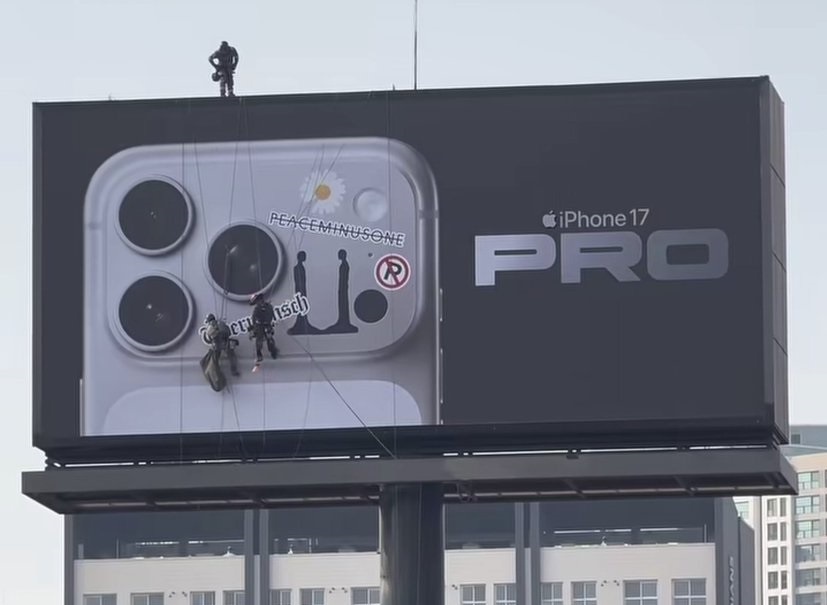 Logo album Übermensch và nhãn dán đặc trưng từ thương hiệu thời trang PEACEMINUSONE của G-Dragon xuất hiện trên biển quảng cáo iPhone 17 Pro. Ảnh: Instagram.
