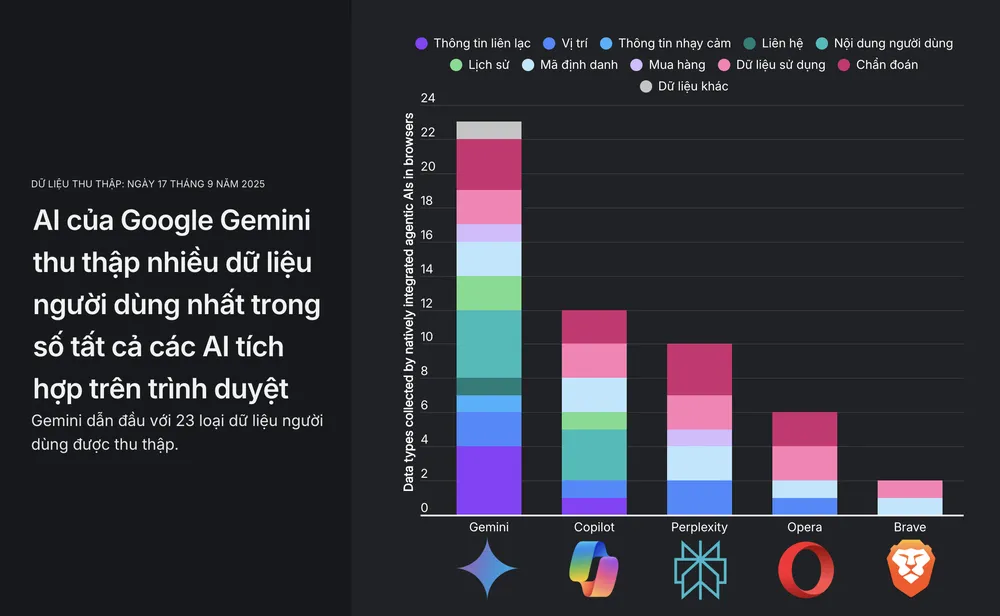 Mặc dù tiện lợi, nhưng Gemini thu thập dữ liệu nhiều hơn bất kỳ trình duyệt tích hợp AI nào từng được đánh giá, bao gồm lịch sử duyệt web, dấu vân tay thiết bị và các dữ liệu định danh khác.
