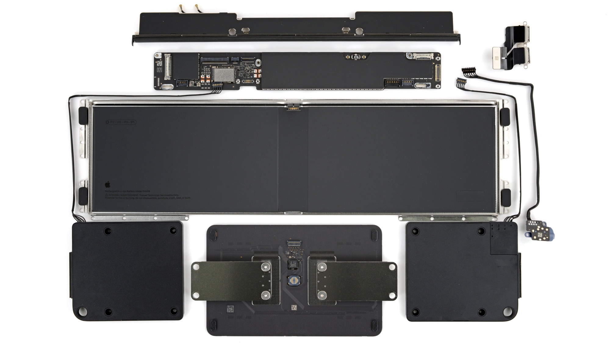 Phần vỏ dưới cũng không cần dụng cụ đặc biệt để mở. Bố cục bên trong được iFixit đánh giá là bất thường theo tiêu chuẩn của MacBook. Pin, loa, cổng USB-C và trackpad đều dễ dàng nhìn thấy rõ ngay sau khi mở nắp.