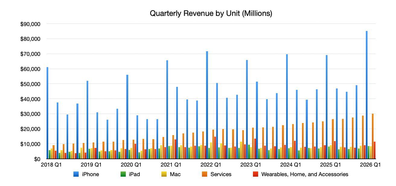 Doanh thu Mac đạt 8,39 tỷ USD, giảm so với 8,9 tỷ USD trong quý 4/2024. Doanh thu từ thiết bị đeo, thiết bị gia đình và phụ kiện đạt 11,49 tỷ USD trong quý 4/2025, giảm nhẹ so với 11,747 tỷ USD trong quý 4/2024.