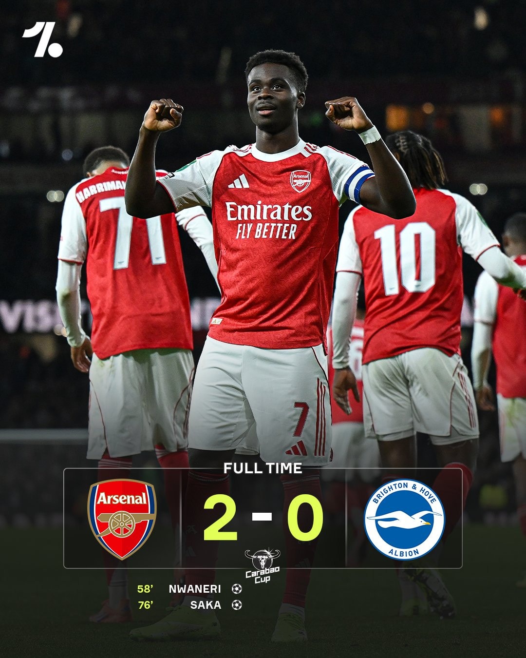 Arsenal vượt qua Brighton 2-0 để giành vé vào tứ kết cúp Liên đoàn Anh, trong trận đấu được định đoạt hoàn toàn sau giờ nghỉ với các pha lập công của Nwaneri và Bukayo Saka. Trước đó, hiệp một khép lại 0-0 trong thế trận ít đột biến, nhưng sự kiên nhẫn của Pháo thủ đã được trả công đúng lúc.
