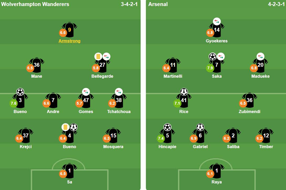 Với bàn dẫn trước sớm, Arsenal hoàn toàn làm chủ cuộc chơi trong hiệp một. Thống kê cho thấy "Pháo thủ" kiểm soát bóng lên tới 68%, khiến Wolves hoàn toàn bế tắc và không thể tung ra bất kỳ cú dứt điểm trúng đích nào về phía khung thành của David Raya trong suốt 45 phút đầu tiên.