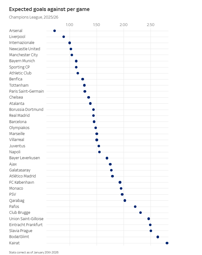 Arsenal sở hữu thống kê số bàn thua dự kiến (xGA) ít nhất tại Champions League, theo Sky Sports.