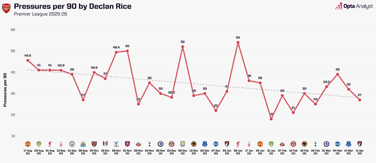 Cường độ pressing của Rice giảm dần theo thời gian. Ảnh: Opta.