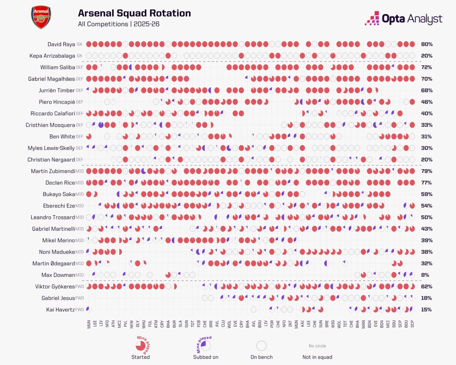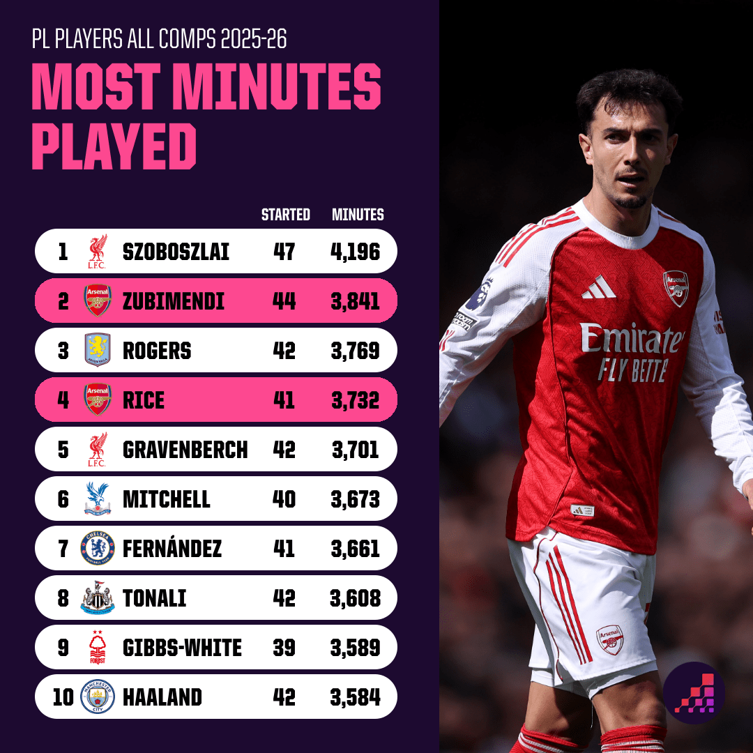 David Raya, Gabriel Magalhaes và William Saliba gần như không bao giờ vắng mặt. Đáng lo ngại hơn là gánh nặng đặt lên vai những cầu thủ ở các vị trí yêu cầu di chuyển cường độ cao như Jurrien Timber, Martin Zubimendi và Declan Rice. Tiền vệ Zubimendi đã thi đấu tới 79% tổng số phút khả dụng, trong khi Rice cũng bám sát ngay sau đó. Sự phụ thuộc này lý giải cho việc độ chính xác trong các đường chuyền và cường độ áp sát của họ có dấu hiệu giảm sút rõ rệt.