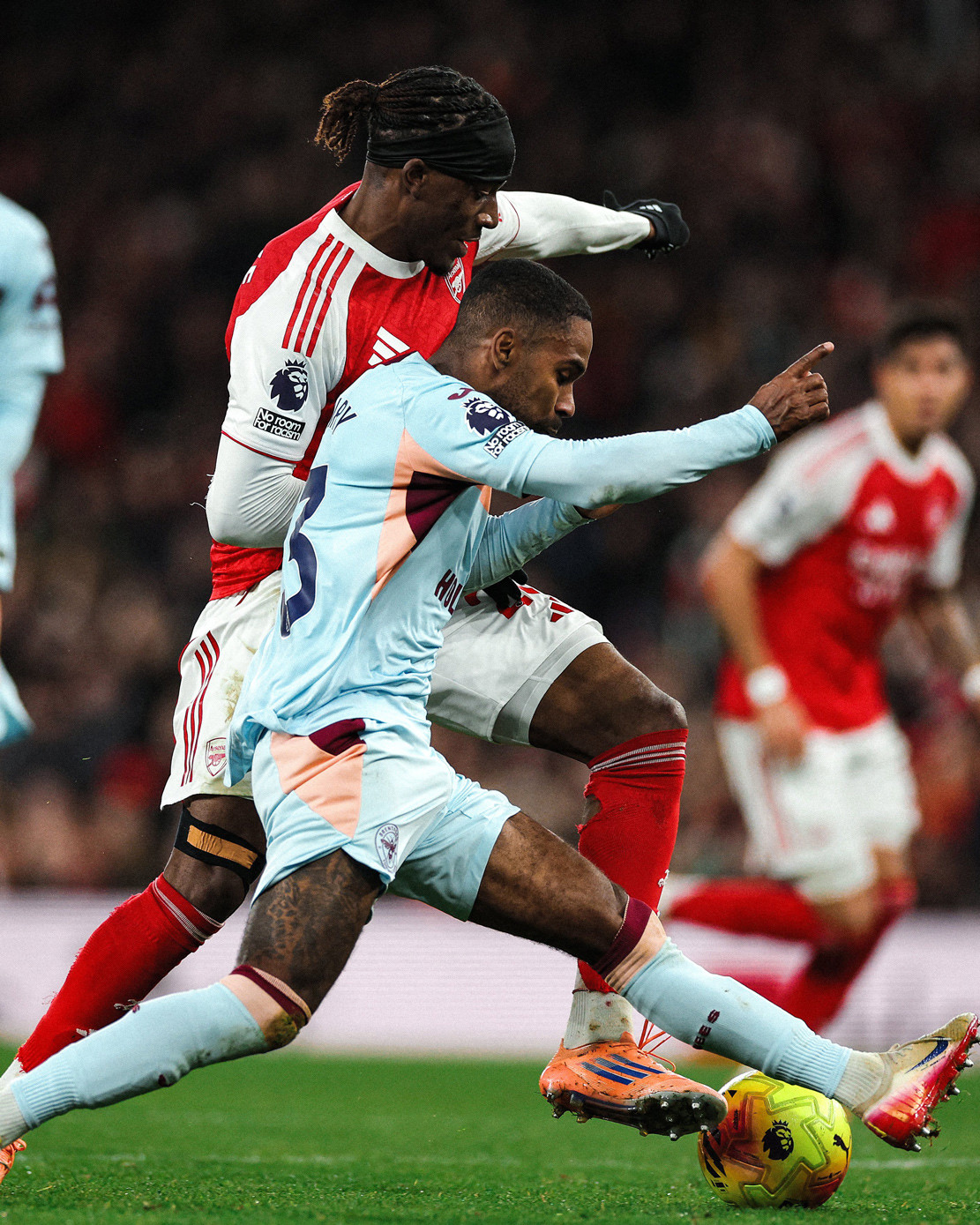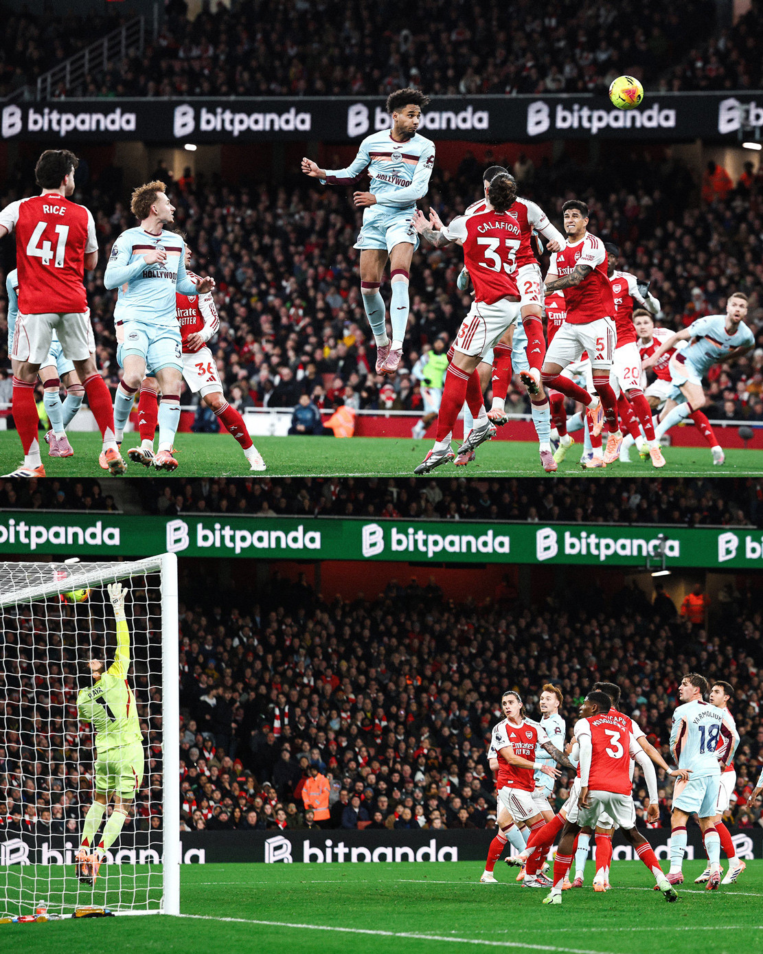 Brentford cũng đáp trả bằng pha bật cao đánh đầu của Schade, buộc David Raya phải trổ tài