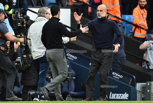 Pep Guardiola đang thắng thế tinh thần trước đàn em Arteta. Ảnh: EPA.
