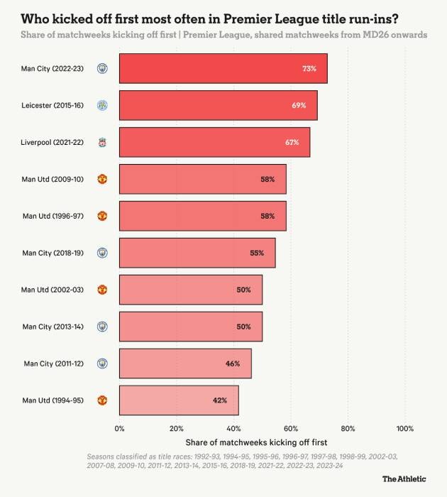 Cựu danh thủ Paul Merson từng nhận định trên Sky Sports rằng chức vô địch có thể được quyết định bởi việc ai là người đá trước. Ông ví von điều này với cách Tiger Woods luôn muốn là người vung gậy đầu tiên trên sân golf để gây áp lực cho đối thủ. Trong bóng đá, khi một đội giành chiến thắng sớm, áp lực ngàn cân lập tức đè nặng lên vai kẻ bám đuổi vào ngày hôm sau với mệnh lệnh buộc phải thắng để duy trì vị thế.