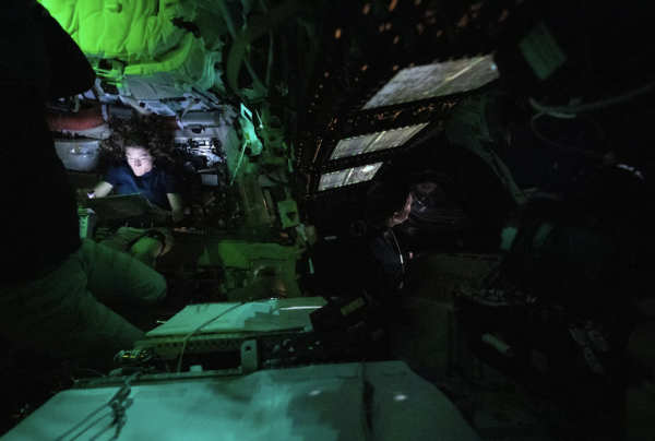 Bên cạnh đó, NASA cũng công bố hình ảnh bên trong khoang tàu Orion. Bức ảnh này cho thấy phi hành gia Jeremy Hansen (Cơ quan Vũ trụ Canada) quan sát không gian qua cửa sổ, khi hệ thống đèn trong khoang được tắt bớt để tránh phản xạ ánh sáng. Trong khi đó, nữ phi hành gia Christina Koch đang làm việc với một chiếc máy tính bảng. Ảnh: NASA